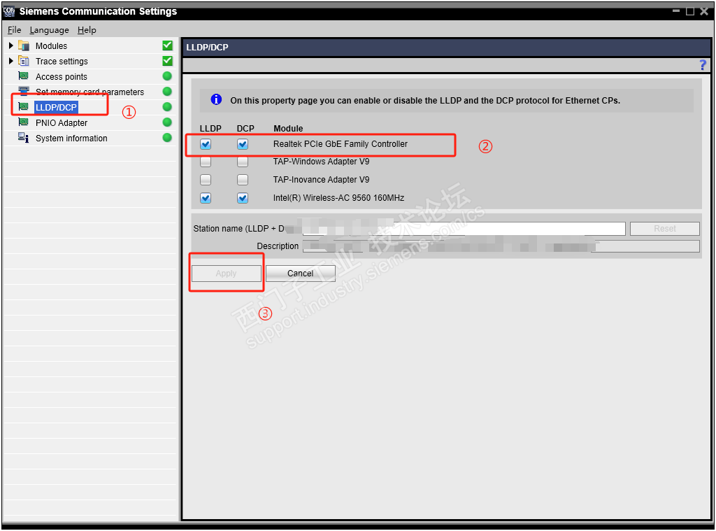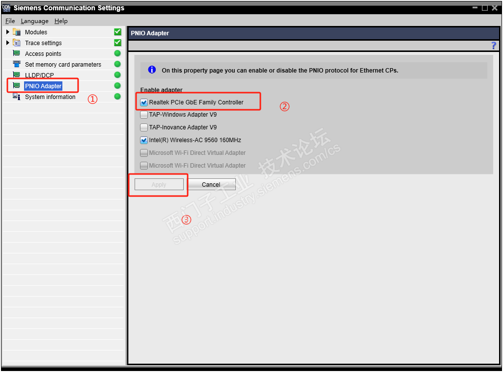2、选择“PNIO Adapter”,在右侧菜单选择电脑连接PLC的以太网卡,然后点击“Apply”应用设置