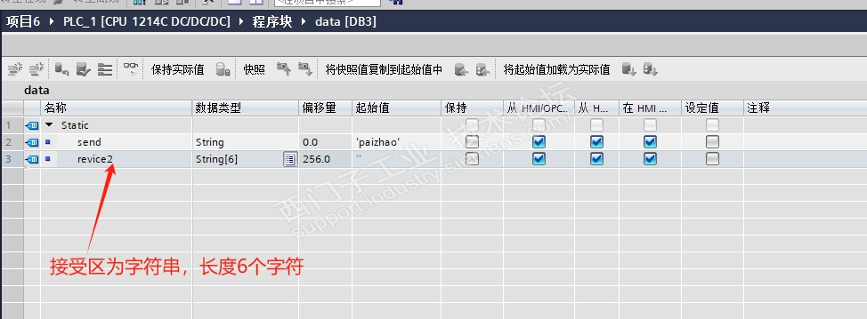 在DB块里新建两个字符串,接受区为6个字符的字符串
