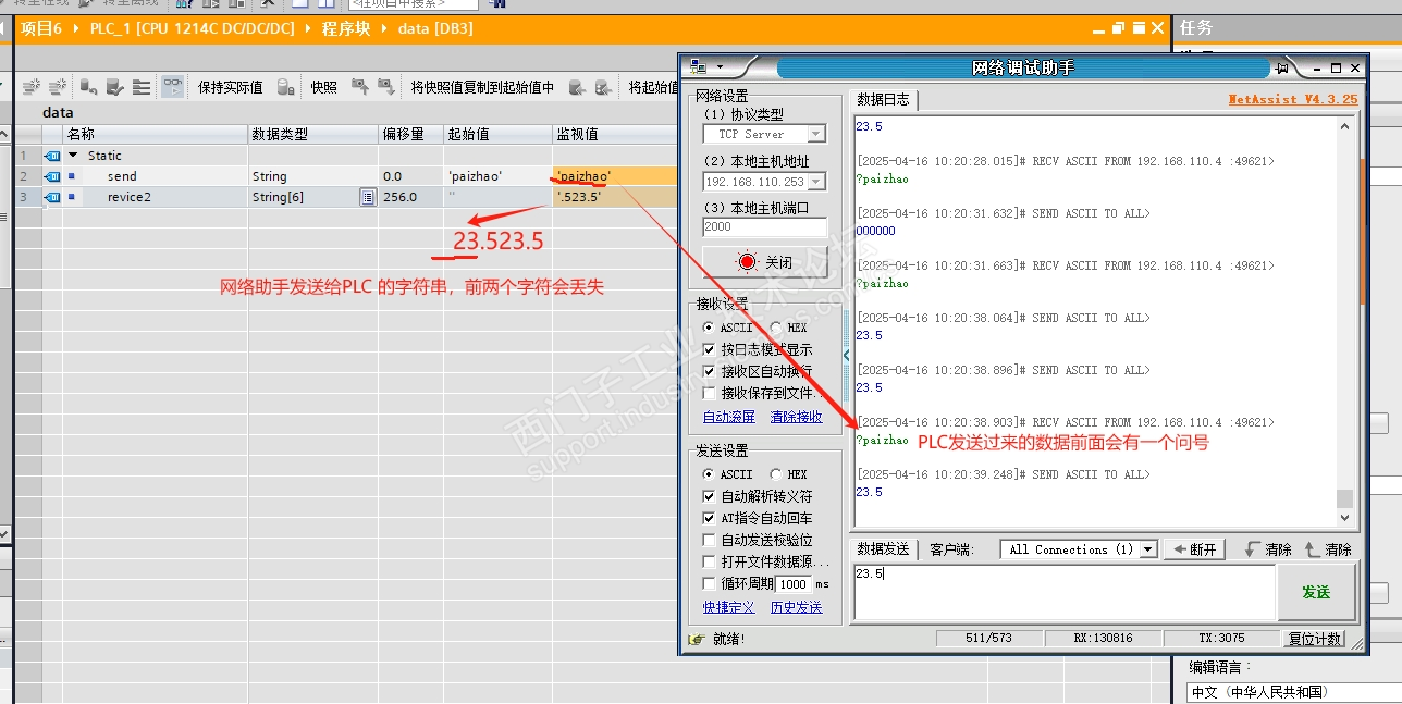 通过网络调试助手给PLC 发送字符串,但是在接受的DB块里 前面两个字符自动丢失了