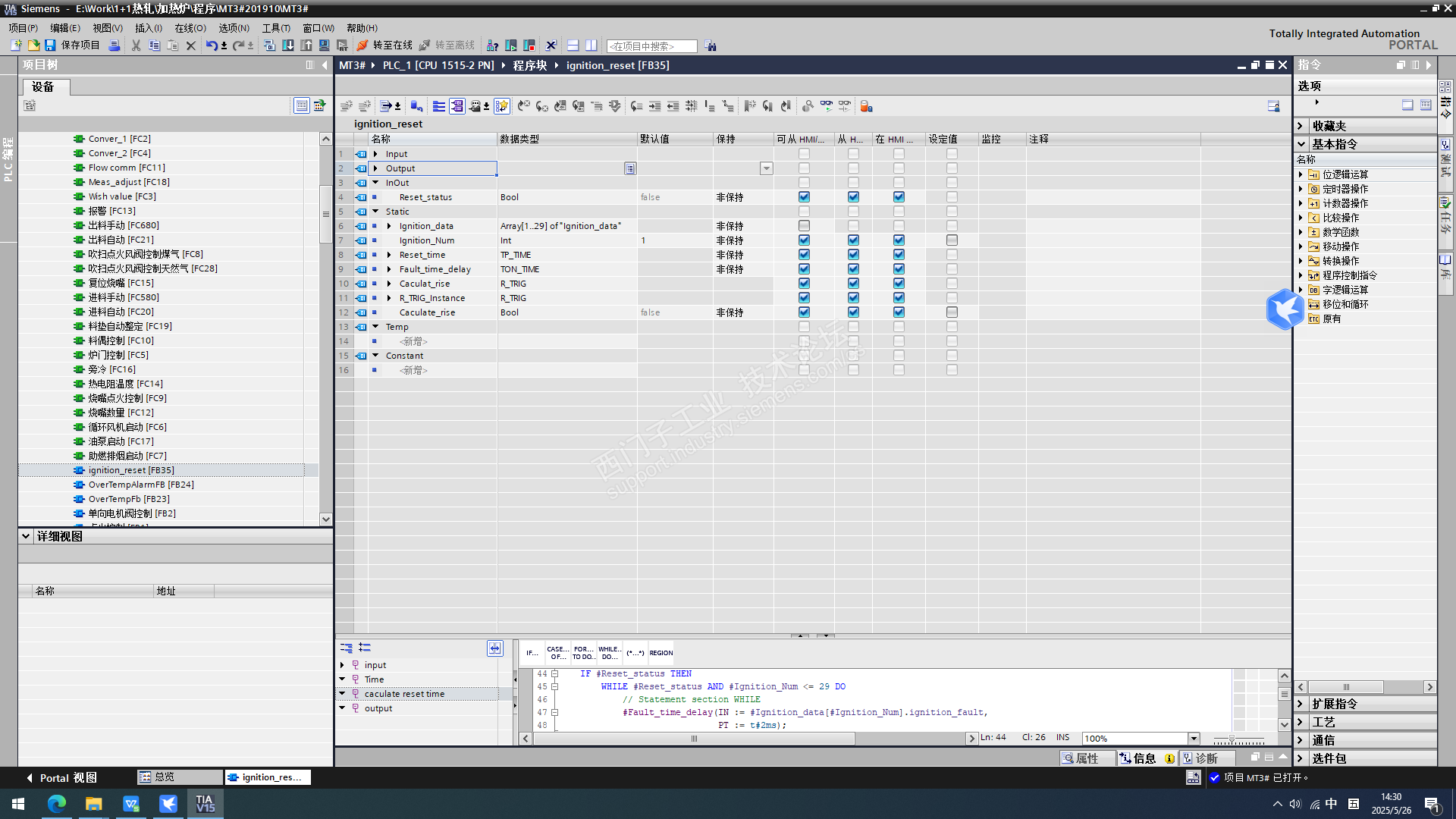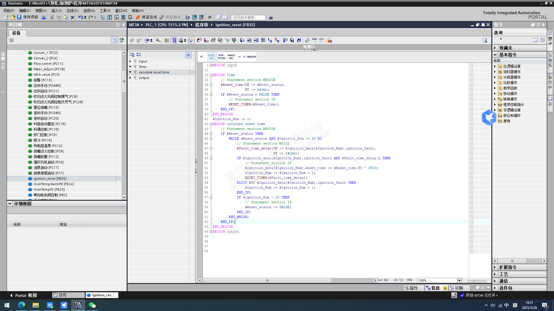 此功能块的作用是判断烧嘴的状态,如果是故障,则产生复位脉冲,每个故障烧嘴时间间隔5S,如果烧嘴没有发生故障,则跳过。轮流点火。避免爆燃现象的发生。