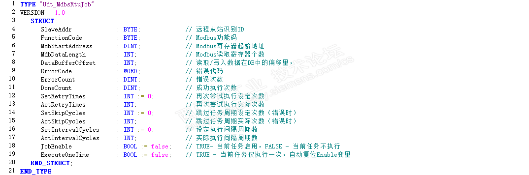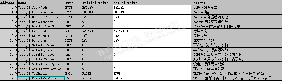使用本例程时需要要用到3个DB,上面提到保存WORD数据的DB和保存BOOL类型数据的DB,数据类型可以定义成数组(推荐,后续再来解析)也可以和你实际读写的名称命名的离散变量;一个配置Modbus任务列表的DB,通常以ARRAY[1..xx] of “Udt_MdbsRtuJob”定义数据,然后在“Data view”视图下配置每条任务: