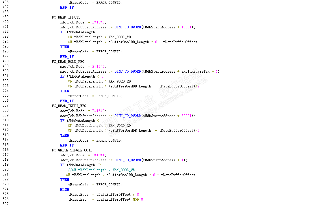 1. 使用标准的Modbus功能码,支持1、2、3、4、5、6、15、16(对于了解Modbus通讯协议的人不喜欢使用西门子Mode加地址格式的方式