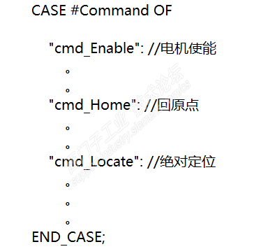首先,由于存在28个电机,而这28个电机的动作基本是一致的(虽然具体实现有所差别),不外乎回原点、绝对定位、相对定位、速度运行、停止运动等这几个动作。自然而然的就想到了面向对象(OOP)的编程方法。为这些电机建立一个类,即一个功能块(FB),FB里面那些变量就是这个类的属性(如图1所示)。其中有一个特别的属性:Command。该属性用于触发这个类的方法,也就是电机需要执行的动作。然后就是编写这些动作的具体程序,用Case Command of…End_Case实现对方法的调用(图2)。最后,再建立这个FB的数组,用For语句循环调用。这样就等于是把28台电机当作一台电机来控制了,程序简明而有效。