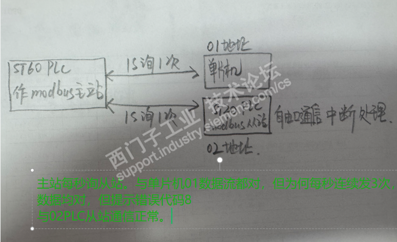 1、硬件构成:PLC(ST60)作为modbus-RTU主站,从站地址01为单片机;从站地址02为PLC(ST20)。请结合图示理解。
