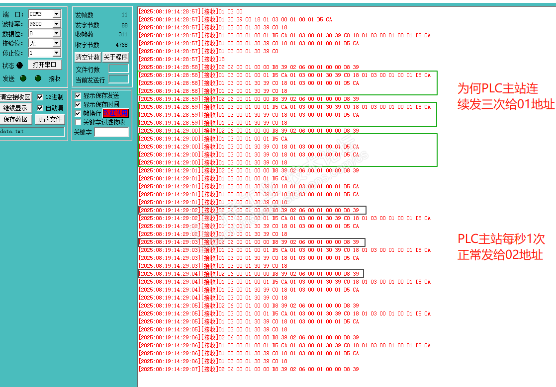 (2)主站发送读取(03)的指令,通信数据正常(请结合数据监听理解);