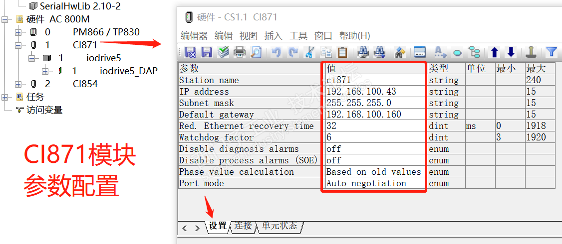 AC800M + CI871:作为 IO 控制器(主站),主动发起通讯,读取从站数据并发送控制指令。