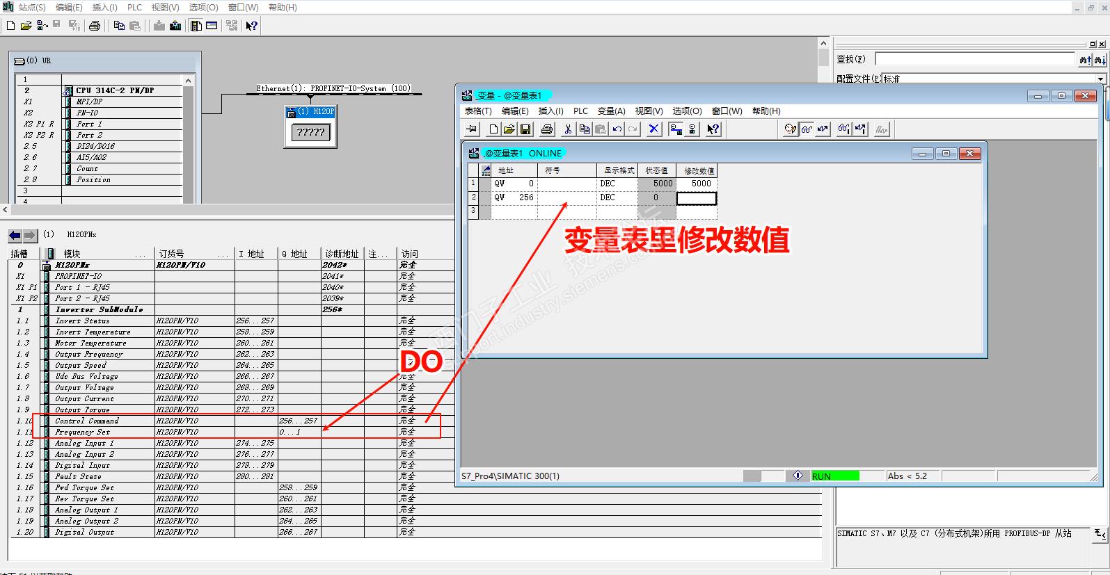 3、在变量表里修改地址数值,对变频器相对应参数进行控制