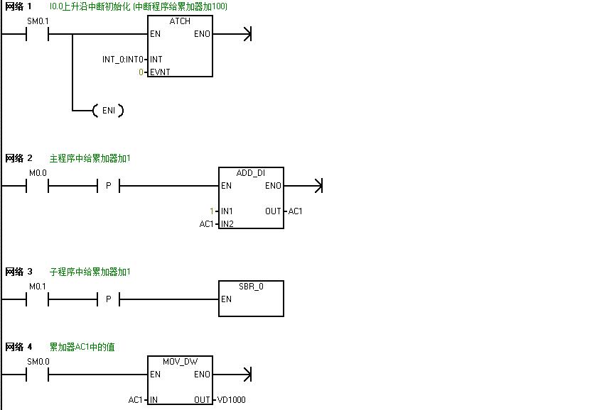 然后,通过外部信号I0.0接通硬件中断后,中断子程序中的累加器AC1进行了加100的操作,并通过VD1008得到输出值。