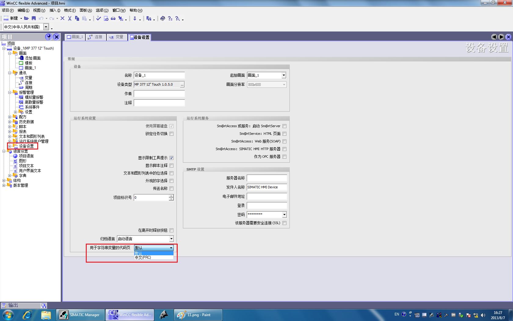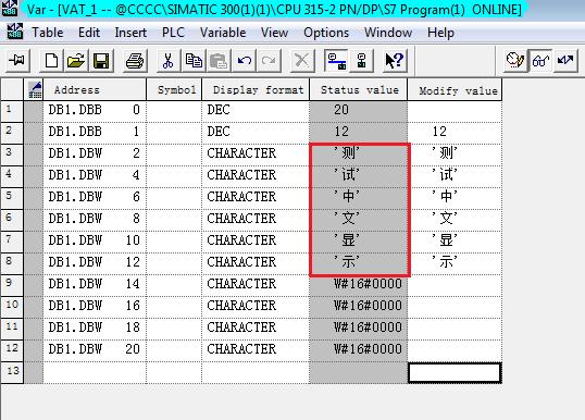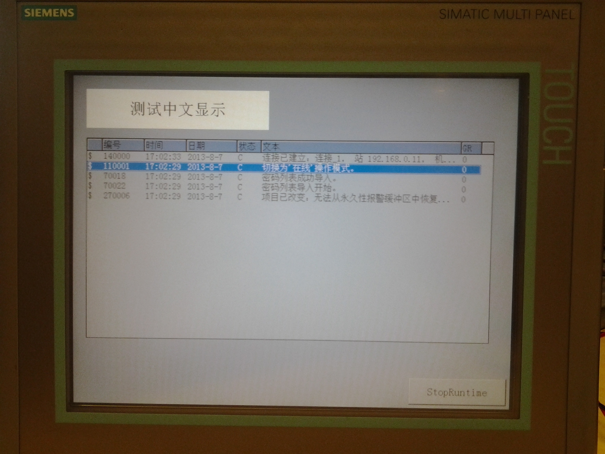 然后做了如下测试: ![]() 新建WInCC flexible项目,新建一个字符串变量,地址为DB1.DBB0: ![]() 创建一个IO域,连接一个字符串变量: ![]() STEP7中DB块的建立: ![]() 在变量表中给字符串赋中文字符: ![]() 把上述WinCC flexible项目下载到MP377中,发现IO域中显示的是乱码: ![]() 在WinCC flexible中打开设备设置,将“用于字符串变量的代码页”从“默认”改为“中文(RPC)”: ![]() 编译后的提示: ![]() 再把这个项目下载到屏中,发现可以显示中文了: ![]() 再来一张: ![]() 但是,目前来说这个功能仅限于MP377。 |