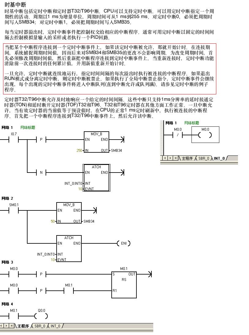 PLC可以用定时中断指定一个周期性的活动,周期时间可以从1ms到255ms,对定时中断0,必须把周期时间写入SM34,对定时中断1,必须把周期时间写入SM35。 1,如何理解这个周期性的活动 比如一个程序; 《主程序》 LD SM0.0 MOVB 200 SM34 ATCH INT_0 10 ENI 《中断程序》 LD SM0.0 MOVW AIW2 VW100 /每200ms读取 AIW2的值 请问这200ms的周期,是从何时开始算的第一豪秒时间呢? |