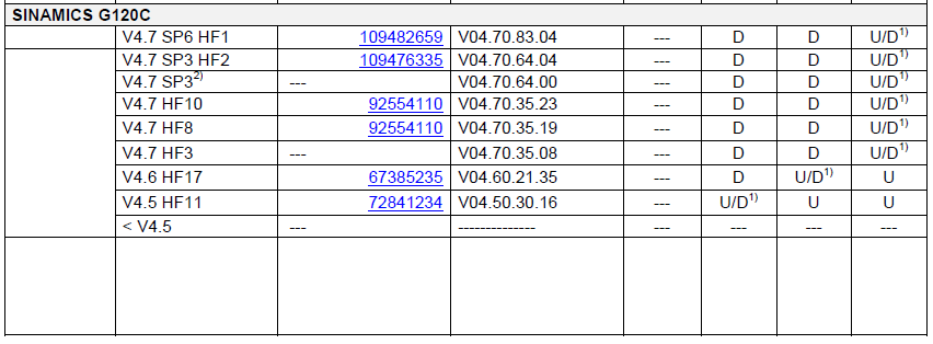 SINAMICS G120P (CU230P-2), firmware V4.7 HF8 (V04.70.35.19) SINAMICS G120 (CU240B-2), firmware V4.7 HF8 (V04.70.35.19) SINAMICS G120 (CU240E-2, CU250S-2), firmware V4.7 HF11 (V04.70.35.24) SINAMICS G120D (CU240D-2, CU250D-2), firmware V4.7 HF11 (V04.70.35.24) SINAMICS G120C, firmware V4.7 HF10 (V04.70.35.23) SINAMICS G110M, firmware V4.7 HF11 (V04.70.35.24)