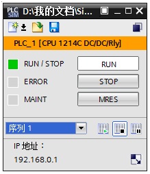 选中项目树中的PLC_1站点,执行菜单命令“在线”→“仿真”→“启动”,打开S7-1200/S7-1500的仿真软件S7-PLCSIM V13的精简视图,自动生成一个S7-PLCSIM V13的项目。 同时出现“扩展的下载到设备”对话框。按下图设置好“PG/PC接口的类型”“PG/PC接口”和“接口/子网的连接”,使用CPU的PN接口下载程序。 单击“开始搜索”按钮,“目标子网中的兼容设备”列表中显示出搜索到的仿真CPU的以太网接口的IP地址。 单击“下载”按钮,出现“下载预览”对话框,勾选复选框“全部覆盖”,编译成功后,单击“下载”按钮,将程序下载到PLC。 勾选“全部启动”复选框,单击“完成”按钮。 下载成功后,PLCSIM的CPU自动切换到RUN模式。 选中博途中的HMI_1站点,执行菜单命令“在线”→“仿真”→“启动”,或单击工具栏上的“开始仿真”按钮,起动HMI运行系统仿真器。编译成功后,出现仿真面板和根画面。 单击 “起动”按钮,变量“起动按钮”(M0.0)被置为1状态,由于PLC中的梯形图程序的作用,变量“电动机”(Q0.0)变为1状态又变为0状态,画面上的指示灯亮。单击画面中的“停止”按钮,变量“停止按钮”(M0.1)变为1状态后又变为0状态,指示灯熄灭。