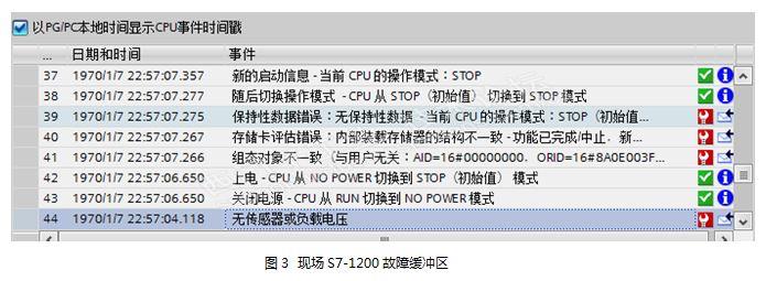 通过编程软件Portal进行进行诊断,查看CPU诊断缓冲区,获知信息和用户反馈一致: S7-1200 断电后重新上电,仍处于STOP模式。 2.问题分析 Problem Analysis 将用户其中一台PLC的诊断缓冲区导出,进行分析。如下图所示,CPU从上电到不启动中间主要有两个事件影响: 1、CPU 错误:存储卡评估错误:内部装载存储器的结构不一致。 2、CPU 错误:组态对象不一致。