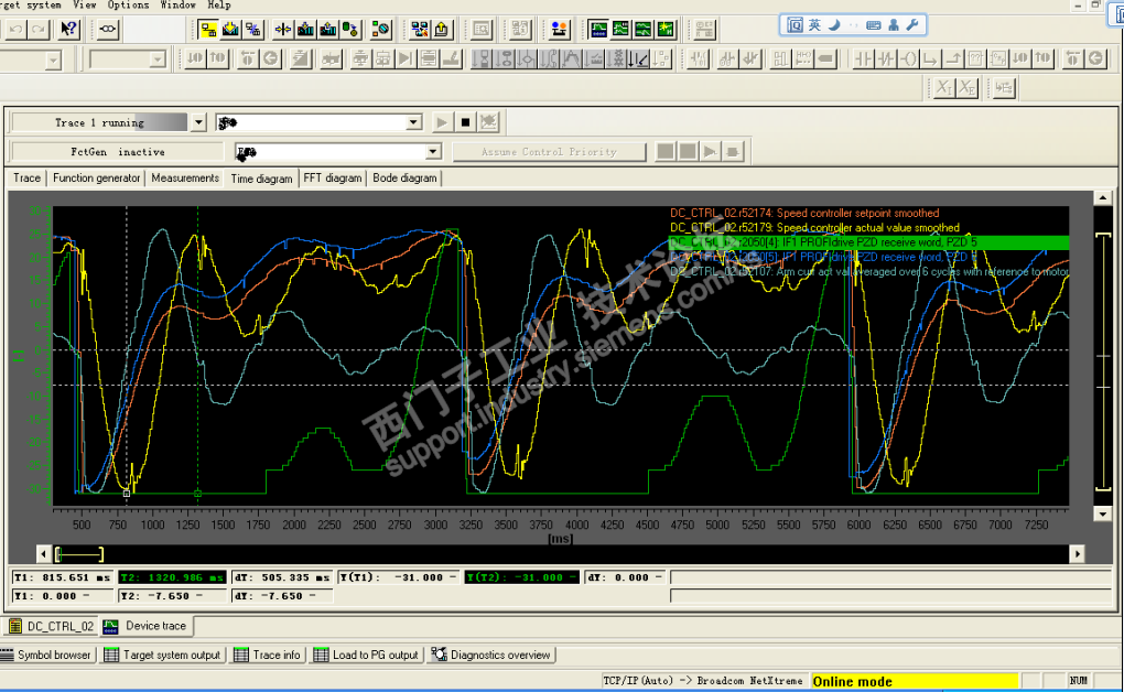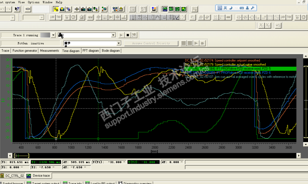 主题:大家帮 我看看我这速度环比例是大还是小,特性是硬还是软呢 我控制一个设备,用的控制传动是6RA80.有位置环有速度环,图片里蓝色线是位置环,红色线是速度给定,黄色线是速度实际值。 这个系统电机带设备优化出来的速度环比例是30多,但是连续运行时比例超过8,空转时速度实际值自己就上下波动,给定600转,上下波动几十转,现在速度环比例设的7. 实际生产时,根据位置变化输出速度给定红色线,结果速度实际值并不跟速度给定趋势一致,而是像图片中那样。 好心人帮我看看,我的速度环比例到底是高还是低呢,调两天了,无论位置环怎么调,最后位置环偏差都有一个100多的数,死活调不下来,唉。