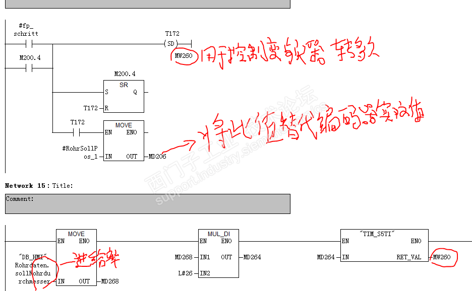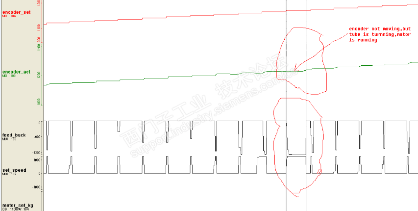 主题:回复:搞技术还会有什么前途,一个自动化展会几百个公司,几千个技术员~~压力太大了吧过程分享: 故障现象是:辊轮没有规律性的在有时不转,有时反转,造成磨废钢管。 去诊断之前他们检查过:变速箱,抱闸,坦克链的电缆,编码器接线端子。 开始诊断: 1. 记录编码器旋转状况,变频器实际是否在运行。 2. 根据波形确认找到故障点为:编码器偶尔没有转,而电机实际是转的,初步怀疑编码器问题,手动转动编码器应该是转一圈是20000的数值,而实际转一圈没有,只有17423,编码器确实有问题。 3. 问题是换编码器设备就会好,但是且没有备件,采购周期要4周时间,生产是停不起的。 4. 分析程序: 5. 修改程序先生产,等备件,用MD206来替代IR_XIst的编码器的反馈值。 6.运行测试正常恢复了生产。