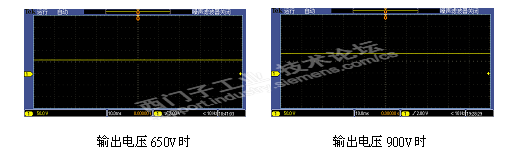 2. 利用西门子PLC和LOGO!控制器作为状态监控和电压给定,对功能参数的读取更直观,控制更方便。 二、 控制系统完成的功能 1. 利用西门子PLC进行模拟量的处理,并通过专用仪器对照实测电流和电压参数进行调整后,可以实现精确的参数观测及远传,实时计算飞轮的存储功率,通过读取稳流稳压控制板的过流、过热、过压、缺相等保护信号,在程序和界面中加以体现,确保飞轮的稳定可靠运行。另外,该控制程序还增加了根据负载轻重自动投切滤波电容,从一定程度上消除了小功率负载接入后大的直流滤波电容器产生的惯量,从一定程度上提高了控制精度和系统的动态性能。 放电系统采用高压IGBT,使用光线驱动技术,通过LOGO!去给定放电参数,而且具备多种放电曲线供测试时选择,最终放电采用1分钟为周期,循环放电的方式,软启动、软停车,避免了对整个系统的冲击。通过对电流电压值的取样、标定,在LOGO!的自带屏幕上可以准确显示实际值和给定值。 2. 调试过程中的问题 由于所应用的西门子产品都是成熟技术,在调试过程中除简单校正了显示参数之外,几乎没遇到什么问题。 在测试时,因为IGBT的RCD吸收电路没有做好,造成一只芯片过压击穿,重新更换IGBT并优化吸收电路参数后,故障排除。 在现场调试时,因客户定制的电阻箱容量不足,造成电阻起火烧毁,经我方与电阻厂家协调后,已更换足功率电阻箱。 3. 电源波形图 3.1直流电源输出波形 因为用户的使用范围是DC650V-DC900V,所以在实际测试时,我们分别抓取了底限650V和高限900V的波形,纹波系数完全满足用户的要求。 4、整流系统在调试时主要针对输出的给定、滤波电容的投切、输出功率的计算作了重点的调整,对输出电压、电流以及相应的过压过流值根据可用要求在触摸屏上作了调整。 4.1 给定值的运算: 下面给出了各项给定值运算方法和编程思路。 // 1、整流给定值运算 // 2、放电给定值运算,放电按照显示值进行控制,即,最大允许1.2倍的给定量程 // 3、整流给定值的逆运算 // 当采用近控时,给定数值由近控控制 // 当采用源控制,给定数值由远控电位器控制,并进行逆运算,防止近远控给定数值的不一致性 // 4、放电的电压要比给定电压至少高10V,否则被代替 // 5、加辅助关断,用于故障关断 4.2 滤波电容的投切: 电容的投切控制是根据投入的负载电阻决定滤波电容器的投切级数。 滤波电容投切的思路: // 设定参数保存 // 将系统参入写入到永久性存储器中 // 根据状态位修改需要写入的 // Cn 投入的总电容值 // C1、C2、C3每级的电容值 // R 计算所得的负载电阻值 4.3 输出功率的计算 功率计算是根据客户要求后加的程序,直接在现场进行了修改,即用V*I/1000换算为千瓦数。通过功率的显示,可以很直观地读出飞轮存储的能量,反应储能和能量释放过程的动态变化。 //VD508 电流测量值 VD512 电压测量值 VD524 功率值