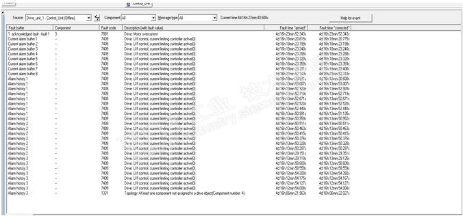 由参数可以看到:由于在变频器待机状态下已经有0.6A电流,当变频器工作起来后,即使在轻载的情况下,其工作电流仍会达到所连接断路器的整定电流上限,造成某些断路器跳闸,但这并不能完全解释所有的跳闸现象。 2)利用Starter软件,查看客户的程序及故障报警历史纪录,发现新的问题,几乎所有的报警代码都是A07409,最后的故障号是F7801 :