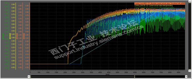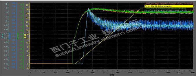 现场进行几种状况的测试,分别是变频器不做任何优化,也不输入电机各项参数,接上电机就转;按照电机铭牌输入参数并采用V/F线性控制(p1300=0);按照电机铭牌输入参数并采用不带编码器的矢量控制,且做了各项优化。特意采集相关参数trace 曲线(监控参数如下): R66:输出频率;R68:电流实际值的绝对值;R76:磁通电流实际值;R78:转矩电流实际值;R80:转矩实际值 图15 变频器不做任何优化(P1300默认值为0),采用系统的默认2.2KW 参数值,直接启动的曲线 图16 采用P1300=0(V/F控制),并正确输入电机参数以后的曲线 图17 采用P1300=20(无编码器矢量控制)控制方式,并进行各项优化以后的曲线
