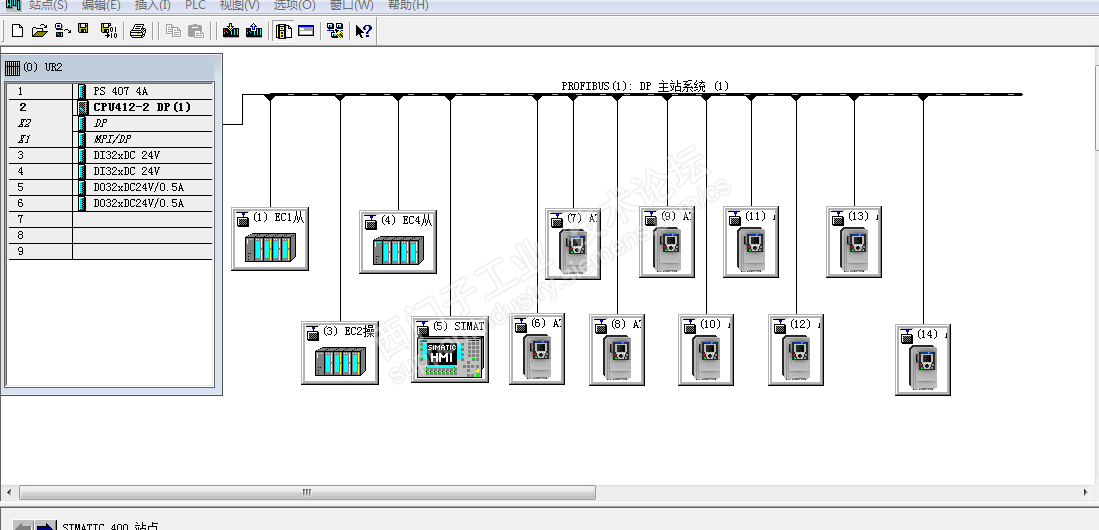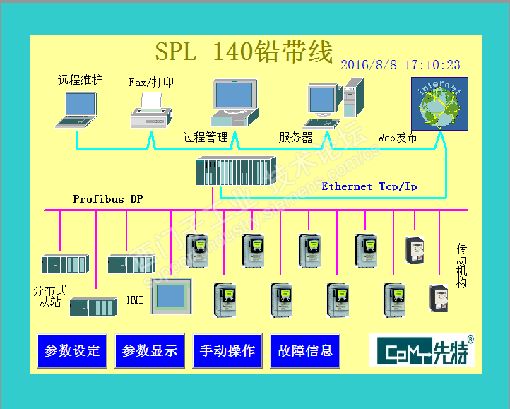 很早就收到关于这个活动的邮件,一直没能真正的静下心来写一写自己的故事,尽管闲暇之余,也在论坛里泡着,帮着别人解决问题,学习别人指导问题。 我的第一专业是正宗的电气自动化,09年毕业后也一直从事于相关的工作,从跟着工程师打下手,到参入调试,设计,甚至改进,到最后自己主导项目设计,用了两年多的时间,相对而言,职业旅程还算顺利。 对于西门子论坛,我一直心怀感激,因为我个人的成长之旅,很大程度上得益于在西门子技术论坛的沉湎,当然,期间也不免浪迹于在“亿万论坛”“工控人家园”“中国工控网”论坛等。我2010年注册,至今已有六年,青葱岁月,从小鲜肉到老腊肉,只是弹指一挥间。那是兑换一本《电气自动化传动手册》只要200金币,如今已是1500西币。上浮之快犹过房价,个中感慨,不言而喻。 六月江南,火云如烧,忙里偷闲,我也来秀一则分享,请君鉴赏。 连铸连轧冲网线 一、工艺简介 将铅或铅合金毛坯经平辊冷轧加工成厚度小于0.5mm的带卷的过程。铅箔主要用于β和γ射线防护、结构防湿、照像底片包装、无损探伤和电缆**等方面。常用的品种有纯铅箔、铅锑合金箔(含锑0.5%~8.0%)和铅锡合金箔,也有锡一铅一锡的夹层铅箔。中国铅箔的尺寸规格是:厚度0.01~0.50mm,宽度50~400mm,长度大于5m。 铅的密度11.34kg/dm3,熔点327℃,常温下塑性良好,变形抗力很低,屈服极限只有6~8MPa,抗拉强度为16~19MPa。铅箔的生产流程如下: 也许有朋友接触过吧。 二、硬件配置 先看一下硬件组态吧,选取了其中一部分。 大体上的网络配置是这样的。 硬件配置:西门子的PLC和分布式+ATV71系列变频器+WinCC。 三、电气机柜。 这个控制系统相对比较大一些,机柜大大小小的,也比较多。非常遗憾手上暂时没有照片,只能看看截图了。 主控柜之一 操作站之一 还好,查了一下备份,找到一张机柜图,我们的制作还是比较规范的。 主控柜之一 四、HMI 配置:MP277和Proface 移动操作站之一 画面分享如下: 控制参数设定主画面 过程参数显示主画面 过程参数显示画面之一 由于比较担心称重过程中零点会漂移(称重对象不规则,操作不便),我特意做了一个校准画面,每称重100次后,提示操作人员手动校准一次,以免称重失准。 五、冲网生产线线 关于冲网部分,由于涉及到技术保密,不便做详细说明,见谅。此外,收卷和放卷过程没什么好展示的,因此亦不作赘述。 冲压过程的图片还是可以看看的。