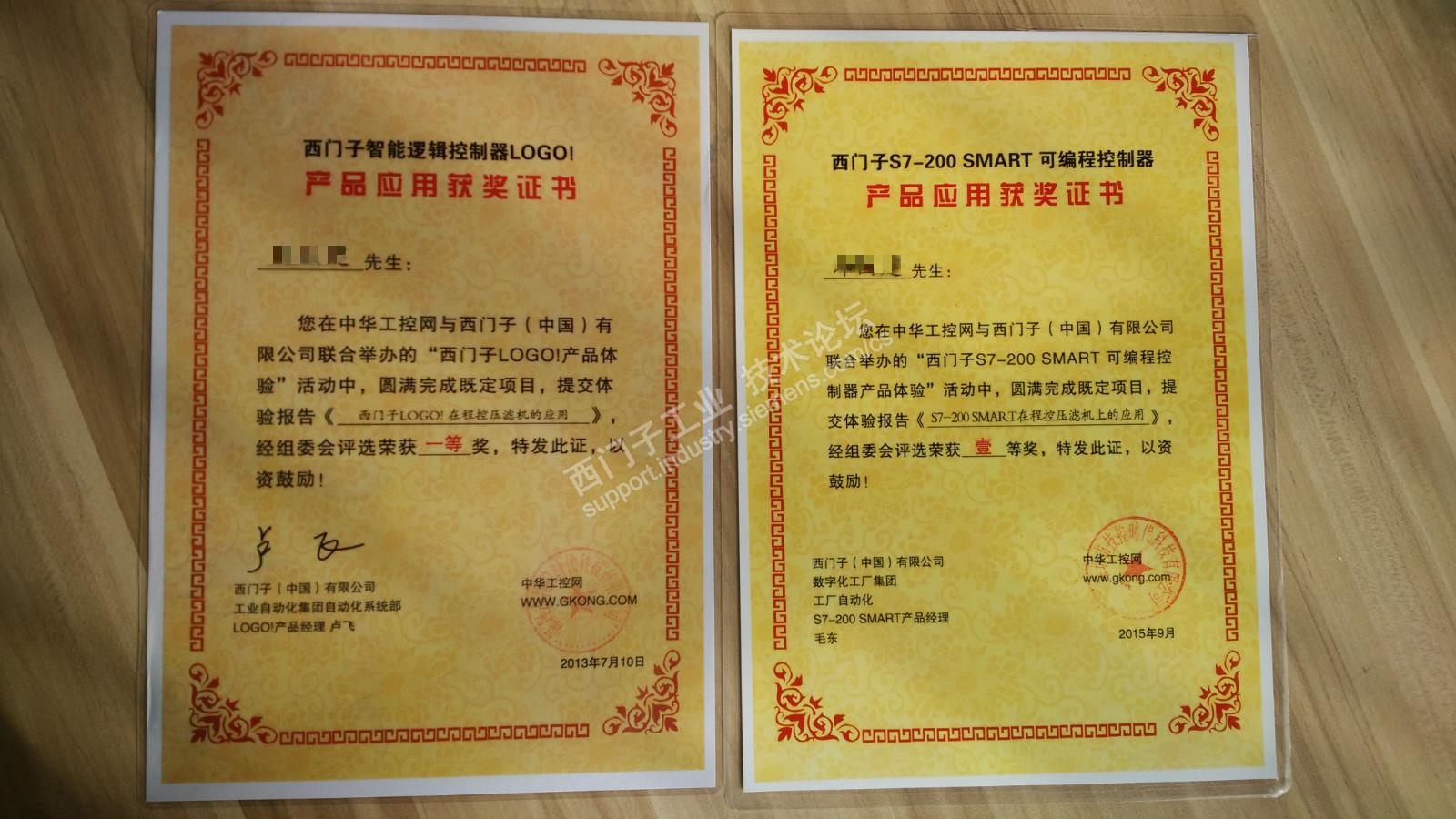 两台S7-200通讯,当时还不知道有DP头这玩意,试验时就这样,实际安装时去电子市场买了几个DB9串口头。 当时是这款PLC准备更新换代的时候,相信有人会认识,现在已经绝迹了,我当收藏品来着。 记不得从什么时候开始,就上手了SMART触摸屏,不过清晰记得第一次用的是威伦,PLC是LG,那个费劲啊,简直找遍了网上所有资料,还好当时有本编程书册。不知道大家有没有西门子的编程手册(书本的),很少有吧--我也没有!哈哈。 直到用上了S7-200 SMART和SMART 屏,才懂得编程是一种享受。 一个发到甘肃的设备,还去现场了一趟,只因弄错了RTD的量程(第一次用热电阻模块)。 出于好奇心,自费买了个步进电机,学学高大上的运动控制,算是掌握了基础的入门知识。 这次,算是用上了SMART家族,也体验了一把USS协议的快感。细心的朋友也许已经发现,用了SMART V3屏,这次,用上了DP接头,调试过程随便用线,柜内接线当然用原装DP电缆了,紫色的好贵,但物有所值。 这是和其他变频器485通讯的项目,也算折腾了,一共三台变频器,还两种品牌,不过前面累积的经验下来,对通讯还是顺理成章的。 当然也有坏的时候,这时这么多年以来,第一块也是唯一一块PLC损坏,SF/DIAG常亮,过了保修期,打算自己折腾下,最后以失败告终,现在躺在待处理的废品里。 再来一张西门子小型家族成员大集合的,呵呵,只可惜缺了LOGO! 获奖时刻,参加过西门子很多活动,这是其中两张,都是一等奖 结束语 从一开始上手西门子的逆向思维转变,经历痛苦挣扎的教程反复揣摩,再从一个个项目实践中成长,现在的我,对西门子有种说不出的感觉,最近申请了S7-1500的体验,不知能否有幸上手。 |