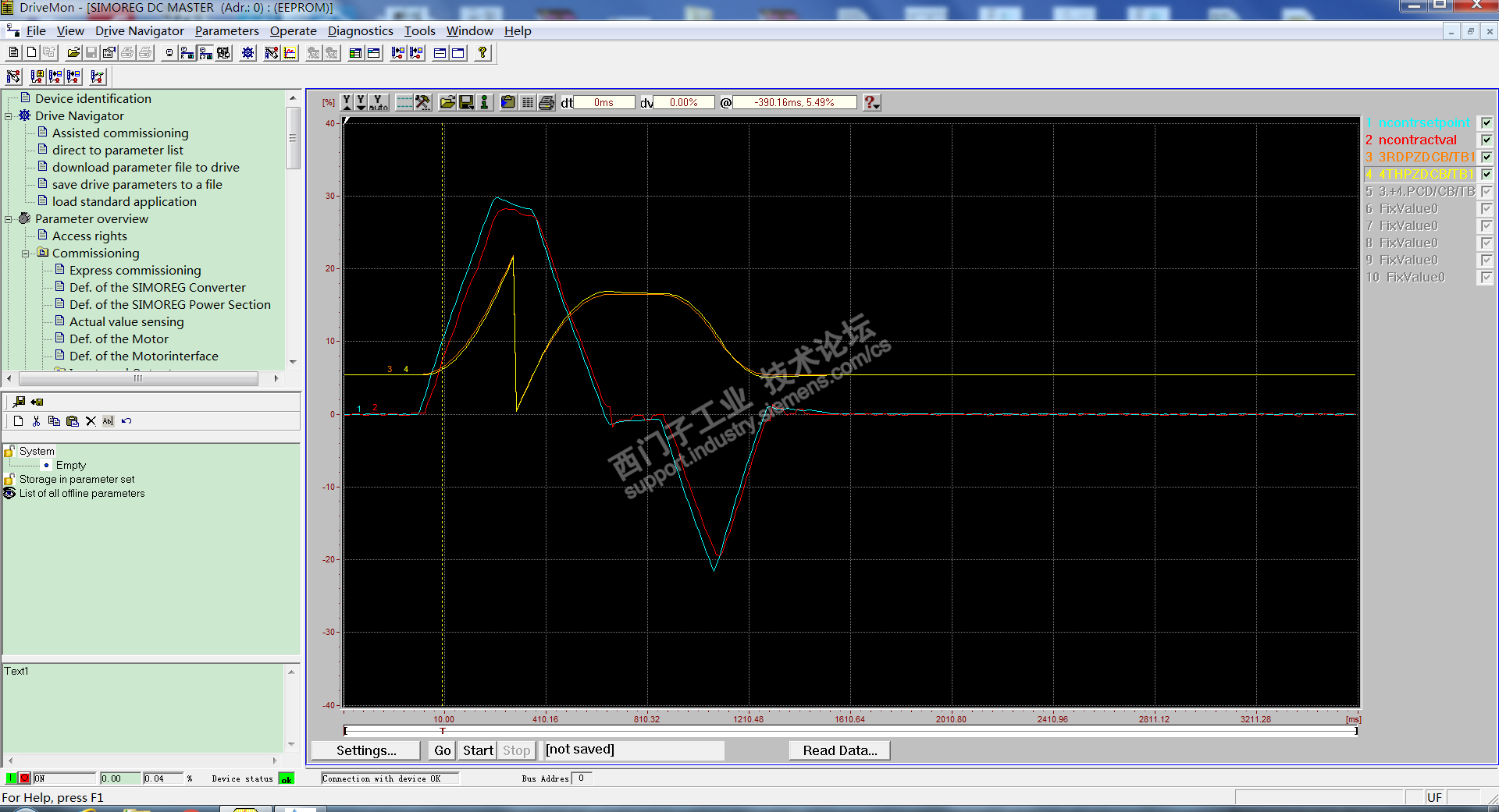 对于设定速度经常大幅度变化的应用,例如飞剪,适当的加上转矩预控能取得很好的效果。直流调速器由于主回路是可控硅元件,它的导通每隔3.33ms一次,对应的开关频率是300Hz和交流系统动辄几千Hz的载波频率比较而言,反应是很慢的。也就是说直流调速的电流环的响应速度比交流的慢很多。以前的直流伺服系统主回路采用的也不是可控硅(小功率) ,采用PWM方式,因此也能达到1-2KHz的开关频率。这里指的是主回路采用可控硅的直流调速器。如果我们知道了速度给定的变化率,也知道系统的转动惯量,那么就能预先给电流环一个给定值,而不必等到实际速度偏离给定时再通过PI调节器产生输出,这样能大大加快电流环的响应速度。 其他参数都相同,使能或不使能转矩预控的区别: 使能了转矩预控 没有使能转矩预控 |