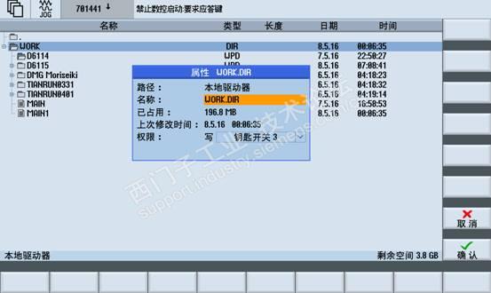 模具加工程序动辄上万条指令,根据工艺要求划分为几个程序,每个程序大小约5M,NC存储器只有4M,程序无法装载到NC,只能存于4G本地驱动器中,常规程序调用的默认路径是NC存储器,操作人员采用每个程序单独执行的方法,加工完一个程序更换下个程序,增加操作人员劳动强度。 采用EXTCALL指令,利用给定路径访问本地驱动器、USB设备、网络驱动器上的主程序或子程序。 1、 在本地驱动器新建WORK文件夹,属性WORK.DIR 2、 在本地驱动器新建D6114工件类型,属性D6114.WPD 3、 在本地驱动器新建MAIN主程序,属性MAIN.MPF 在主程序中分别调用本地驱动器中的程序 EXTCALL “LOCAL_DRIVE:/WORK.DIR/D6114.WPD/D6.MPF” EXTCALL “LOCAL_DRIVE:/WORK.DIR/D6114.WPD/D15.MPF” EXTCALL “LOCAL_DRIVE:/WORK.DIR/D6114.WPD/D4.MPF” EXTCALL “LOCAL_DRIVE:/WORK.DIR/D6114.WPD/D3.MPF” M30 注意事项 1. 使用指令EXTCALL 可从外部存储器中回装和执行零件程序。 可用的外部存储器包括:本地驱动器、网络驱动器和USB 驱动器 2.各驱动器的英文标识符 本地驱动器: “LOCAL_DRIVE:” CF 卡:“CF_CARD:” USB 驱动器(前操作面板):“USB:” 3.如加工同一种工件,可使用外部程序路径的预设,在以下设定数据中可以预设至外部子程序目录的路径: SD42700 $SC_EXT_PROG_PATH 此路径和 EXTCALL 中指定的程序路径及标识共同组成待调用零件程序的完整路径。 以D6.MPF举例说明: 外部程序目录的路径应设置为: SD42700 $SC_EXT_PROG_PATH= LOCAL_DRIVE:/WORK.DIR/D6115.WPD 用于调用外部子程序的路径说明: · 未使用预设时:“LOCAL_DRIVE:/WORK.DIR/D6115.WPD/D6.MPF” · 使用默认设置:“D6.MPF” 4. 不建议在执行外部程序时使用USB 驱动器。 如在执行零件程序的过程中由于振动导致的接触不良、脱落以及因碰撞或误拔出而中断与USB 驱动的通讯,会导致加工停止,造成刀具或工件损坏。 参考 【SINUMERIK 840D sl/828D 工作准备部分 编程手册】