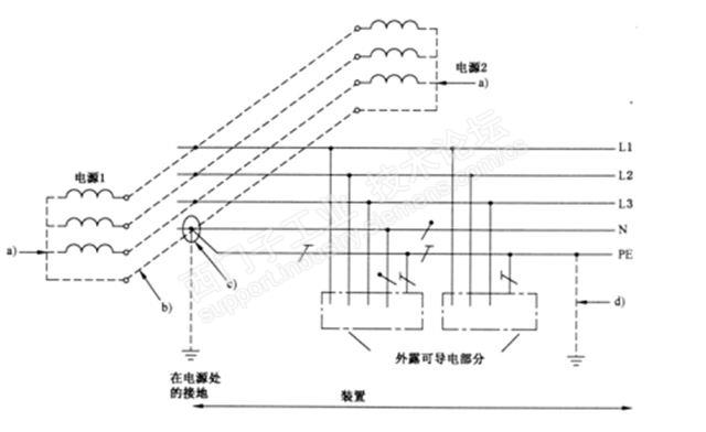 (2) 而对于具有多电源的 TN 系统,应避免工作电流流过不期望的路径。 对于具有多电源的 TN 系统(图 1-8)和对用电设备采用单独的 PE 和 N 的多电源 TN‐C‐S 系统(图 1-9),应符合下列要求: