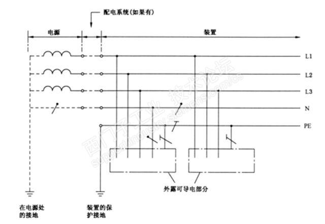 2. TT 系统 应只有一点直接接地,装置的外露可导电部分应接到在电气上独立于电源系统接地的接地极上(图 1-10和图 1-11)。对装置的 PE 可另外增设接地。 图1-10 全部装置都采用分开的中性导体和保护导体的 TT 系统 图1-11全部装置都具有接地的保护导体,但不配出中性导体的 TT 系统