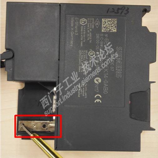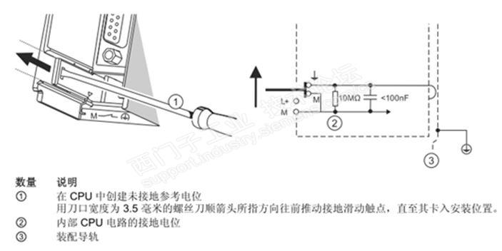 (2) CPU的接地连接 1) CPU 31x 接参考地电位 在S7-300的CPU的电源端子处,插着一个滑动金属片,将该滑动金属推进去时,DC 24V的M端将通过该滑动金属片与CPU的安装导轨相连,通过导轨实现接地,所有从M来的干扰电流都可以被释放至接地导线/地(图2-3)。 默认情况下,滑动金属片都是推进去的。 图2-3 CPU31X的接地参考电位示意(默认状态) 实际设备中如下所示(图2-4): 图2-4 CPU上的滑动金属片未拔出 2) CPU 31x 浮地系统 如果系统的“地”并不干净,或者希望将系统做成浮地的,则可以将该金属滑动片撬出,此时M和导轨分开,系统与“地”是不直接相连的,而是通过 RC 回路进行隔离连接的。 图2-5 CPU31X的未接地参考电位示意 实际设备中如下所示(2-6):