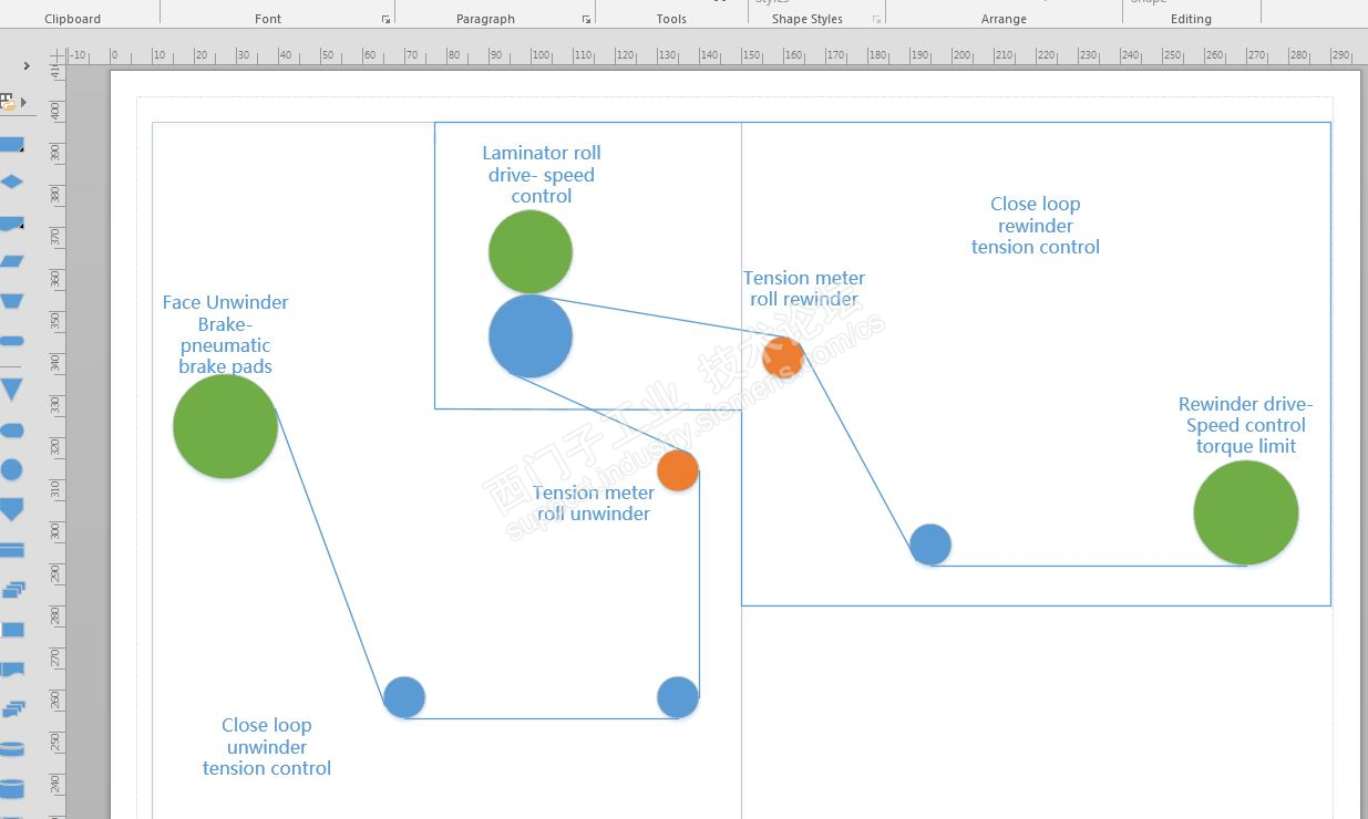 公司有条涂布线,听老员工说年龄比我还大,控制器已经改成S7-400,所有外设都采用IO接线方式接入PLC,驱动是老旧的ABB ACS600,通过IO接线与PLC连接。整个系统基本上没有通讯,线速度也很低,最高车速100m/min。今年上半年某一天下大雨,房顶漏水正好滴在了电器柜上,导致收卷驱动进水600变频器报销,维修部门用ACS800代替,结果收卷经常出问题,起步松卷然后突然张紧断纸几率很高。收卷过程中也容易出现收卷不齐的问题。问题被扔给了我,以前也没做过卷曲的项目,正好用这个烂线练练手。找维修的自动化工程师拷贝了程序,直接现场去。 这个收卷部分在忽略涂胶机构的话可以看成一个复卷机,系统如图1所示,图中是我对收卷驱动的升级方案,(原来采用什么控制方式我没有去细究)采用速度控制器饱和加转矩限幅,带收卷LOADCELL的闭环张力控制。 为了达到收卷驱动器速度环饱和,就需要将收卷驱动作为从机,跟随主机(这里是复合棍驱动,将2层纸复合在一起)的速度,以主机线速度为从机速度设定值,并且外加一个正的超速补偿,由于主机与从机之间有纸张连接,并且主机的出力大于从机,这样在正常的运行过程中作为从机的收卷电机会与主机保持一样的线速度,由于收卷电机达不到它的设定速度,这样就会导致收卷驱动速度控制器饱和,转矩环输入为额定满转矩,然后在通过转矩限幅,就可以达到控制收卷张力的目的。 既然是收卷采用速度控制,那么首先需要解决的是收卷驱动的快速调试工作,这里ACS800变频器采用DTC控制方式,加装一块RPBA-01 做profibus通讯,这样能省去很多的接线任务,调试过程也轻松很多。一路参数设置完成,通讯正常,电机辨识优化完成,ACS800已经ready。然后工作的重点就移到PLC了,删除原有的收卷控制程序,把我的FC269替换上去。 FC269中有如下功能块:收卷loadcell的标定与滤波,收卷直径超声波的标定与滤波,收卷驱动的速度控制,收卷的张力控制,简单的锥度控制(实际使用的是张力设定的线性控制)。重要的就是速度控制与张力控制。 对于速度控制来说,我们需要保证在卷曲的过程中收卷的线速度要与主驱动的线速度保持一致,由于卷曲的过程中卷径是在增大的,根据公式,有n=V/(πD)*i,直径D由超声波传感器给出,V是主机的线速度设定值加一个超速补偿后的值,i是减速机的速比,这样我们所需要的收卷驱动的转速设定值就有了。 对于张力控制来说,我们要保证材料在卷曲的过程中内紧外松,根据张力与转矩的计算公式,有:M=FD/2i, M为收卷轴转矩,F为卷曲张力,D为直径,i为减速机速比。另外我们还需要考虑摩擦力与转动惯量对系统的影响,所以收卷驱动需要提供的扭矩为M?=M+M?+M?。(在这个系统中,由于最高速只有100m/min,并且加减速时间很充裕,我没有将补偿做进去)利用收卷loadcell做一个闭环控制,将PID的输出叠加到一个启动转矩上,(其实这个启动转矩也可算是摩擦补偿加惯量补偿,只不过这个值是通过不断的调试得出来的)然后将这个值送到ACS800的转矩限幅上,达到控制张力的目的。 从这半年多的实际运行效果来看,原有的起步断纸问题没有了,收卷效果也达到生产要求,纸卷的硬度也有保证,客户很满意。接下去准备有机会的话还是要把惯量补偿做进去,另外还做了一个卷径计算功能,还没有开放给生产使用,打算在下一个升级改造中一起做掉。