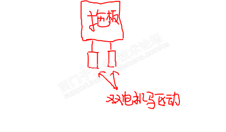设备介绍: 一台机床刀架有二台伺服电机驱动。 故障情况:设备运行了几年突然出现25201和30512报警,当时机器处于停止状态,进给使能和主轴使能处于待机的状态,出现报警后可以复位,然后开Z轴可以工作,但是停止后大约2分钟又出现同样的报警。 处理过程:1.检查齿轮箱并调整问题未能解决 2.屏蔽光栅尺30200:1,30240:【1】:1【2】:0进行测试故障现象一样,并且发现Z轴方向数值发生了变化,从340.49mm变为339.93mm. 电机停止状态怎么会有位置变化,并且Z21的电机温度升高。 3.原因分析Z2轴是主动电机,Z21是从动电机,z21是跟随Z2的没有位置控制,只有速度跟随,为什么Z21会出现25201和300512报警,难道是设备运行几年后机械引起Z21的张力变大,现在通过机械调整不能如愿, 我就通过更改MD37264主从电机之间扭矩从20%改到15%,然后开机测试,之前是停止两分钟报警,改了之后等了二分钟没有报警,再等等吧过了一个小时去看还是没有报警,检查电机温度也没升高,一天下来还是正常的,OK故障总算解决了。 相关参数 : 1.Z轴双电机应用SIEMENS 840D系统的主从功能来消除齿条传动时产生的间隙。 2.控制原理:主从功能激活后,从动轴以速度控制方式按主动轴在负载端的设定速度运动,而不是伺服电机通常的位控方式。通过参数设定,力矩补偿控制器可分配主从轴的力矩,并可在主从之间施加一个额外的张力,PI控制器计算主从间力矩偏差所需负载侧的速度设定值。 3.Z轴双电机采用速度耦合,即主从动电机速度一致,主动电机位置由光栅尺控制,从动电机不检测与主动电机的位置误差。 4.主从电机扭矩分配与速度耦合一致,各50%。 5.扭矩补偿器增益系数为0.5,积分时间为5S。 6.主从扭矩为20%,用于消除主从间隙。 参数号 Z2 Z21 37250 速度耦合的主轴号 0 3 37252 力矩控制的主轴号 0 0 37254 探头平衡控制偏置 0 0 37255 激活力矩平衡控制器 0 0 37256 力矩平衡控制增益系数 0 0.5% 37258 综合执行时间 0s 0s 37260 力矩平衡控制极限 100% 5% 37262 一直激活master slave (激活主从功能)1 1 37264 Master-Slave扭矩 (产生主从之间的张力%)0 15% 37266 时间常数牵引力矩 0s 50 37268 从动轴的力矩 50% 50% 37270 主从速度公差粗略 5% 5% 37272 主从速度公差精确 1% 1% 37274 转化从轴的运动方向 0 0