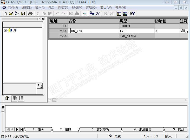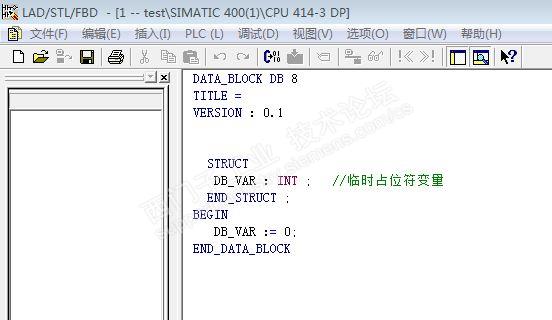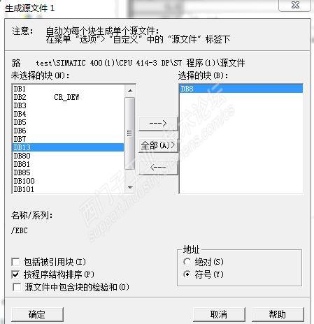 一.DB块的生成 为什么要生成DB块呢?是因为西门子的DB块不能直接复制粘贴(只能粘贴某单元格),为了能快速的编程我我们就需要快速的生成想要的DB块。所以常用的时候我们是用STL或者SCL来生成DB块,STL和SCL生成DB块的语法几乎一样,这里就以STL为例子来生成DB. 千万不要看《如何将EXCEL表格中的STEP7变量导入到DB块中?》文档,这个就是坑爹的文档,看了如下的办法你对比下就明白该文档坑爹在什么地方了,不想初学者们走弯路! EXCEL的做法 1.(老手忽略这段)STL生成DB的模板,如果写不来STL的模板,可以如下 然后在 文件--> 生成源文件 或者“Ctrl+T”快捷键 保存成STL源文件 好了源文件就有了,这个该简单吧新手可以这样搞,老手忽略。注意源程序中有一个BEGIN赋值的段,这个可以删除,用我下面的写法就可以赋值了。 然后制作对应的数据如 直接复制EXCEL到STL即可(坑爹的手册是要转换的) 直接编译即可。 2.稍微进步一点的 直接在EXCEL中弄(有颜色都没有关系,做好EXCLE颜色备注多方便啊) 然后复制粘贴到STL中编译即可 二、如何利用好DB块 1.我建议编程尽量使用DB块,因为,每个DB块可以不同,但是里面的内容可以是一样的 比如DB1装了一个Tag1的标签,DB2也装了一个Tag1的标签,DB1的TAG1是作为来源的数据,DB2的是作为处理后的数据,在编程的时候调用不同的DB,标签名可以是一致的。 例子:我的PIW通道叫TAG1,我设置该通道的修正偏差为DB1里面的Tag1,最终值是DB2里面的Tag1,后面两个只是DB名不一样,比如DB1.Tag1和 DB2.Tag1 这个时候我查找替换就非常的方便 2.有些数据没有必要一个去对应数据则可以使用数组 若是结构体也可以用数组的结构体 开放你的思维吧。。利用好这些对编程速度有很大的提高。 利用数组结构体比如设计很多台一样的启停按钮又不想去建立多个变量导入的情况非常省时间哦。 原创文档 请多交流 QQ 275578306