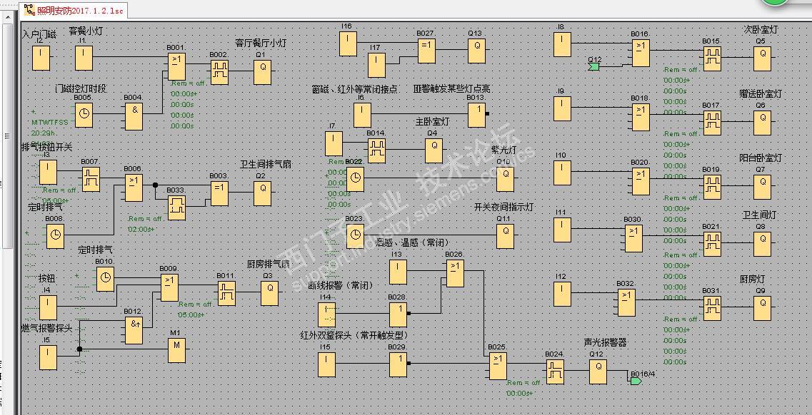 本人专职是建筑安装工程(给排水,电气,新风,地暖,空调,智能化,可视对讲,安全防范等)负责技术和造价的,所以自己家就顺便在装修时把管线都做起了,有的功能还要不断后加,升级(比如买个多路无线遥控板,电路板继电器输出接到LOGO的I点就增加了遥控,买个点动远程继电器模块/手机APP/WIFI控制模块就可以变成手机控制家里的电器),入户门外装了个可视对讲的摄像头,访客按一下呼叫门铃就联动LOGO打开摄像头电源延时5分钟关电,这样可以延长摄像头的使用寿命和省电,家里热水系统管网长,原来在网上买的成品热水循环控制,结果没用几个月控制板就坏了,现在也改在LOGO一起控制了,打开热水龙头几秒再关闭等1分钟再开,龙头就直接出热水不会放掉很多冷水丢掉了……反正能想到的用处都用上了