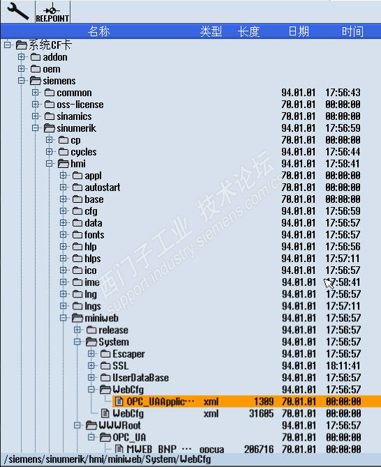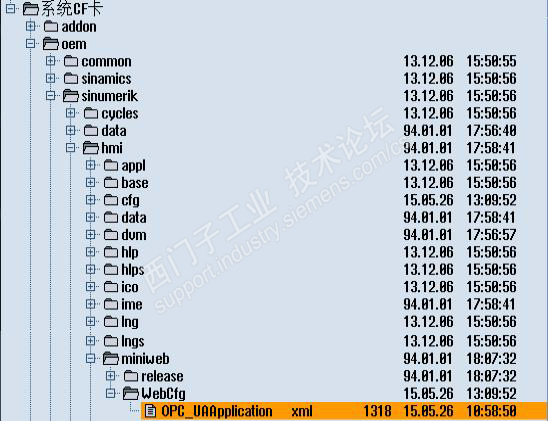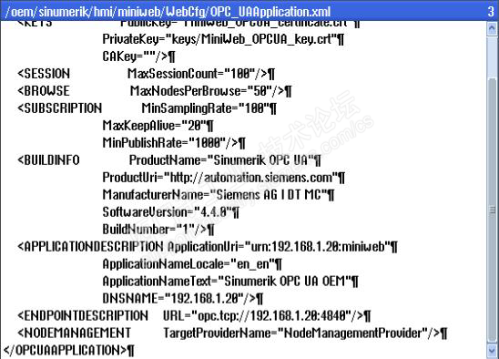 测试平台WIN7版PCU50 840DSL SW4.5 第一步,设置授权 第二步重启系统,进入WIN7 设置好X1口的IP地址,我设置了192.168.1.11,自己笔记本可以设置个192.168.1.2 重启进入operate 第三步:设置配置文件systemconfiguration.ini MiniWeb_win7_systemconfiguration.ini 拷贝到/oem/Sinumeirk/hmi/cfg 自动跳转到这个画面,更改文件名称为systemconfiguration.ini 第四步 配置MiniWeb server 的IP 地址 模板文件:cf/siemens/sinumeirk/hmi/miniweb/System/WebCfg/OPC_UAApplication.xml 拷贝模板文件到 /oem/Sinumerik/hmi/miniweb/WebCfg 目录下 打开OPC_UAApplication.xml替换文件中所有的localhost使用PCU50的IP 192.168.1.11(PS图片借用的),总共有3 处 以上设置就完毕了,重启重新上电!使用西门样例 成功监控到了R参数 R1和R2. 需要的童鞋可以以作参考