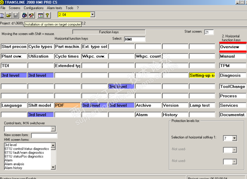 主题:讨论transline 2000 HMI pro cs软件如何使用,@木鱼飘啊飘 把源程序发给我目前已经打开、没有用过 讨论transline 2000 HMI pro cs软件如何使用,@木鱼飘啊飘 把源程序发给我目前已经打开、没有用过 现发图: @木鱼飘啊飘 你有原来的画面吗?看上去不象数控吗,好象是专机。 baidu到这些内容也是不错的。 一、用VCN远程控制PCU50的HMI屏幕