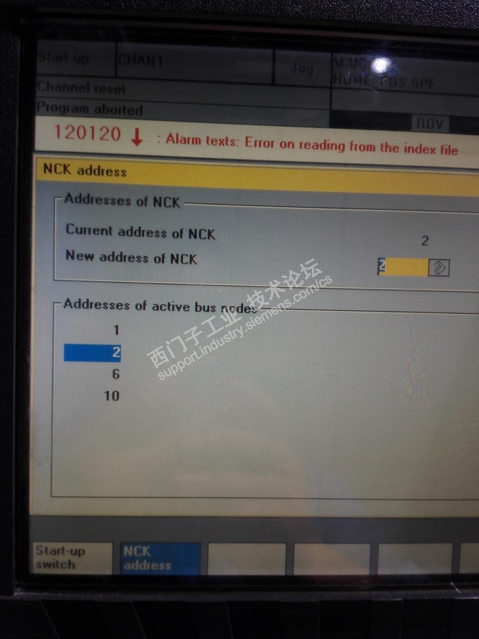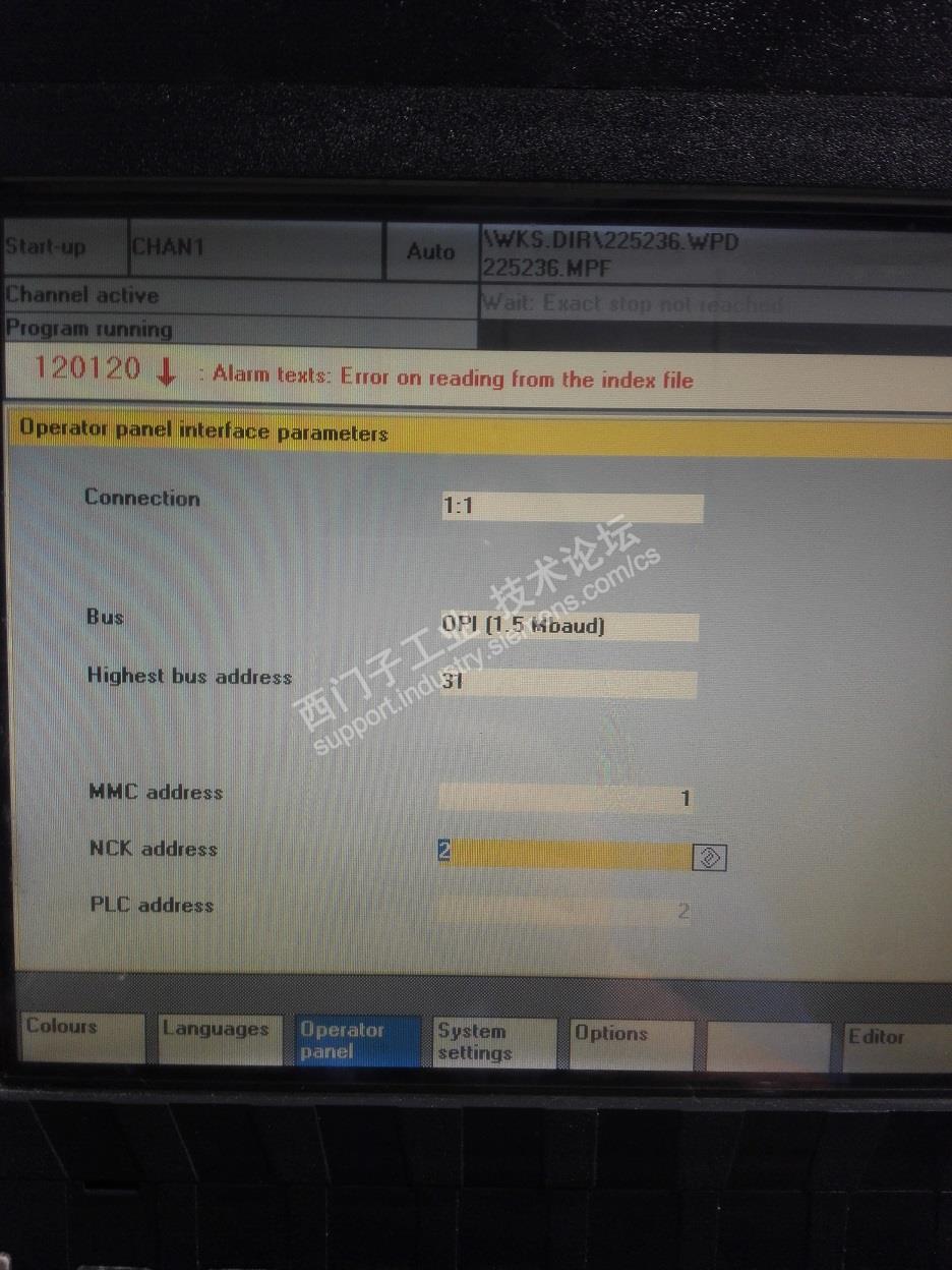 主题:840D OPI节点地址 公司有一台GROB加工中心, OPI网络连了5个节点, OP030操作面板, NCU单元(2), HHU单元, MCP(6), MMC103.但在start-up->operator panel-> node address中却只看到4个节点(1,2,6,10)。 期待高手可以帮我分析一下原因, 另外1,10 分别对应哪个节点。 还有,我们准备更换OP030的操作面板, 但下载完备份文件后,面板和NCU的通讯无法建立, 我怀疑是备份中的通讯参数可能有问题, 新的OP030的通讯参数如下,bus是否应该= OPI,另外 NCK_address=13是否也应该改成2? |