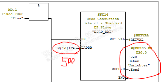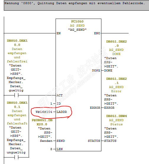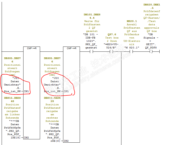 设备介绍:这是一台用来检测管子径向和纵向缺陷的设备,一部份由GE做的超声波,一部份由德尔达做的传动控制部分。 工作原理:是通过超声波检测管子缺陷。 故障现象:从左到右进行检测,T1组探头有缺陷信号第二组T2有波没有缺陷出来,管子换个方向从右到左进行检测,T2组探头有缺陷信号第二组T1有波没有缺陷出来,缺陷距管端300mm. 解决过程: 我一看有点不好下手,超声波探伤我是一窍不通,只能求助操作工,这些信号都是来自GE控制板,又是通过电脑处理的,根本无法和PLC取得关联,从PLC是无法入手的,也只能怀疑电脑软件有问题,我们换了电脑及软件,结果是一样的,怀疑控制的信号有问题全换了也不能解决,没办法奋斗了几天只能举手投降,请求厂家在中国的外援,费用是560元/小时,不是太贵,二个人差不多一万元,厂家来了我得虚心学习,呆在一边观察,没多长时间因为有其他事情,既然我们出了钱让他们去修吧,我也确实不懂,太专业了学了点皮毛而已,厂家忙了一天最终也投降了,要请国外专家,好吧也没办法。 前几天我刚把另一台机器处理好,今天没有什么事,我在想既然从我不擅长的地方走不通,为何不查一下PLC程序呢,打开程序全是德文的,无法理解,我不得不用GOOGEL翻译软件转为英文, 细想了一下,这个波形因该和编码器有关,查到编码器是接在变频器的T400控制板上的,不是通过总线,组态上只有变频器控制字。 很快找到了编码器的数值为:DB305.DBD76,当然也就找到了TTR信号,分为手动和自动控制,而我们刚好是手动测试有信号,但是生成不了检测报告,自动检测是有问题的,再查一下TTR的信号,第一组探头的信号 检测区间是2364~19873,此时编码器数值是:2679,第二组探头的信号检测区间是2864~22873, 而我们做的人工缺陷在2800的位置,画面上有检测波但没探到缺陷,因为TTR信号没有,难道是编码器位置变了,拆下联轴器又是好的,我又手动移动测试车,发现编码器在自动检测时怎么有一个突变为2500的值,我想肯定一个东西触发,到机器上一看,有管端检测传感器I43.6和I43.7进行触发,这个搞明白了,下面我们来看一下不正常时的波形: 从这个波形我来说明一下,当I43.6信号有了之后,测试车自动走26.8s后第二组探头才有检测信号,而我们的人工缺陷只能做到离管端300mm的位置,测试车自动走15s,差不多150mm就要有检测信号,人工缺陷大多在200mm~300mm区间,而根据上面波形,测试信号差不多过了320mm才有。 既然不在检测区间,我把2500改为2600第二组探头不就在检测区间了吗,试了一下结果不能如愿以偿,因为检测区也间变为了2964~22973,我又开始想,只能修改区间值了,也就是第二组探头的区间值,是由DB850.DBD178乘以3=135*3=405,也就是管端405mm是盲区,人工缺陷在300mm的位置。那我只要改DB850.DBD178的值就可以了,很快我在HMI画面上找到了。 可是372的数值可改的但是135的改不了,再一查此数据来自探伤系统的电脑通过网络传送, 探伤系统我无法查,不懂请操作工也不知道,我查了一下PLC的初始值是35,好了我只能通过变量表内进行强制改,改完后进行测试,真神奇缺陷出来啦。 我都不敢相信我自己,我都投降了,国外专家都联系了,这下不用来了至少省了6万元,很可惜前面浪费了1万元。 如果不能修好,自动检测不了管子,手动检测会影响效率,自动是手动的三倍效率,还会浪费人工和电费,供货还不能及时,这无形的损失就不能估量了,影响太大了各个部门的经理每天为这事开会,8月15修不好就完了,还好今天是11日,我的经理压力山大呀!