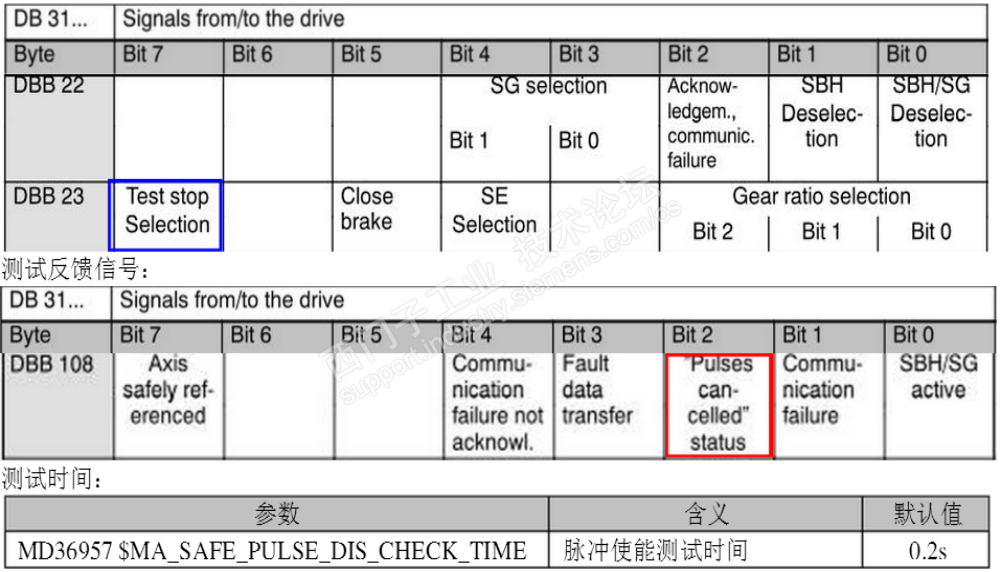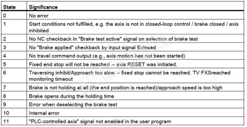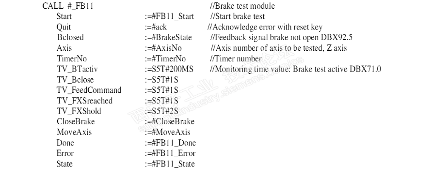 与大家分享很少一部分安全集成方面的事,可能很多坛友都接触不到,个人感觉热衷程度不是很高,今天在这里再分享一部分安全功能测试的话题。在这之后,就不再继续了,如果哪位坛友有兴趣私下交流吧! 安全集成最终要通过安全测试的,安全测试通过才可以正常的应用。 安全标准要求系统首次上电或连续上电8小时必须测试安全功能可靠性能。测试通常分以下几个部分进行测试:1.安全抱闸测试;2.脉冲性能测试;3.外部停检测测试 首先说说安全抱闸测试: 安全制动测试用于测试安全轴抱闸系统是否工作正常,满足制动要求。抱闸反应速度抱闸是否满足需求。 使用固定点功能测试抱闸系统的制动能力。制动效果是否满足要求。注:抱闸测试时,轴监控无效 目前龙门轴也就是主从控制暂时不支持抱闸测试;且测试抱闸测试需在进给百分之一百情况下进行。 实时监控电机的扭矩r80是否达到MD36966的设定值。这一点非常重要。 FB11功能块说明: 还有一点需了解FB11时序图很重要: PLC编程: 使用FB80测试功能块 CALL "Break Test",DB80 STB_Start:=I7.7 quit:=I3.7 condition:=TRUE AxiNo :=3 TimerNO:=T22 FB11错误代码如图: 脉冲测试: 测试输入信号如图 外部停测试 外部停测试输入点如图 每一个安全轴都需经过以上的测试过程。 另外需说明:PLC功能块F79用来测试安全集成外部停功能。 以上为安全功能测试简略介绍,来源调试手册和个人笔记的总结;目的供各位坛友参考。 安全集成调试太多了,大家接触也少,该话题到处暂时结束,待大家有兴趣了解讨论时再将继续......