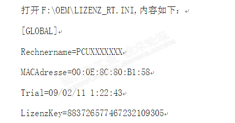 2、  一种是你本身有原来系统的ghost备份,硬盘里边有授权的备份文件,找出来直接键入授权即可。查找位置在F:\OEM\LIZENZ_RT.INI,[GLOBAL]的内容为授权信息,但单对一台PCU而言,更换PCU即失效。