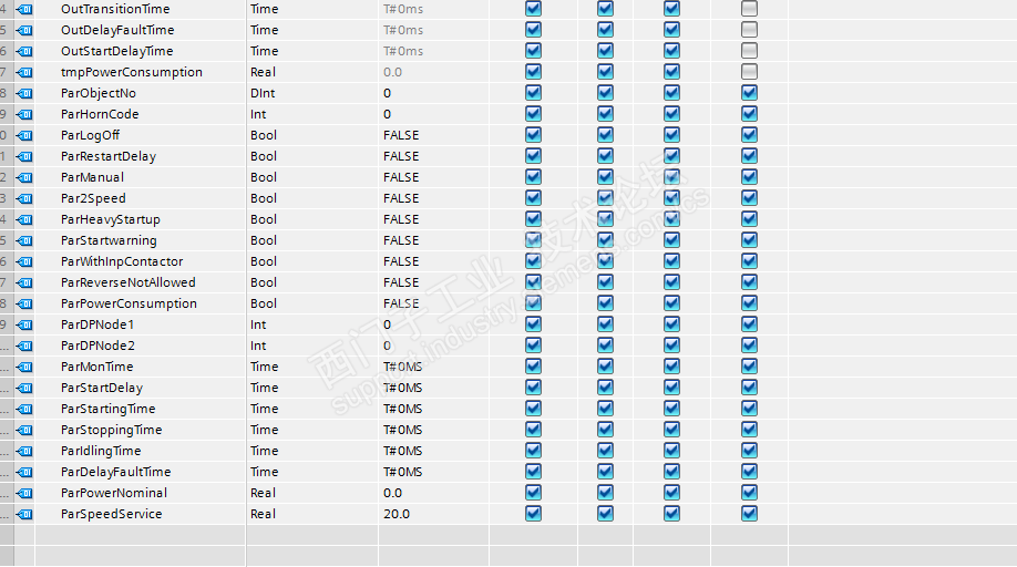 下图中,就是 最简单的一台电机的控制方式,只有一个正转运行信号,和正转控制信号的,程序,我把几台功能类似,工艺要求类似的放在一个FB(组)里,里面的电机以多重背景方式调用,电机的控制信息 又组传递给电机。