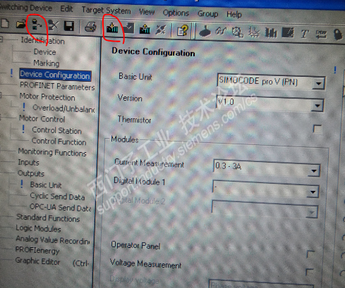 故障情况: D250-60C-C-690V-F由于250KW电机三相短路,导致电机综合保护器爆弧。 处理过程: 2.更换电机综合保护器,利用siemens的专用钥匙,脱开控制线路 3.记下断路器的主要器件的型号:保险丝3ND2 352 接触器3RT1075-2...6热继3UF7200-1AA00 4.按装 simocode es 2007 sp4 hf1软件,安装完打开软件后左上角是SIMOCODE ES Premium 将坏的接220V交流电源,通过DP线连接到工控制机PG的5711卡 5.诊断测试DP地址