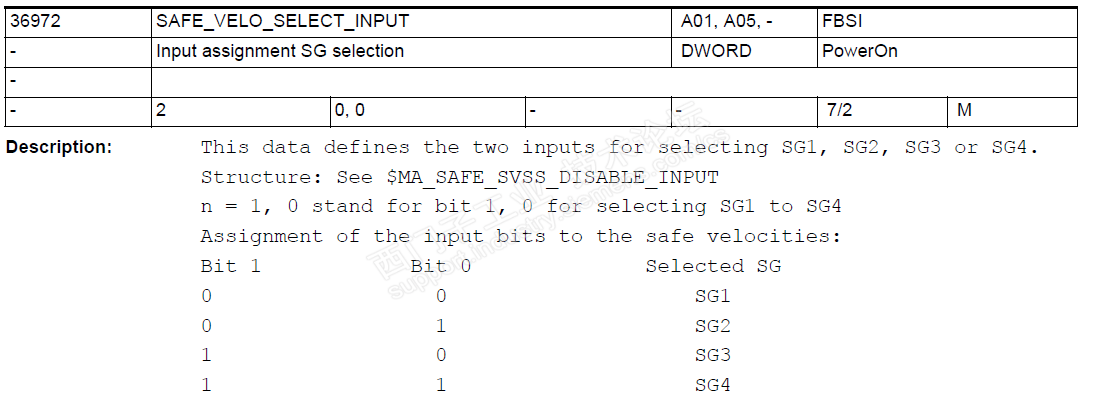 MD 36931: $MA_SAFE_VELO_LIMIT[n] 安全极限速度,需要SG selection来选择SG1到SG4到底哪个生效,这个要看NC端的MD36972和PLC端的DB3x.DBB22如何设置。