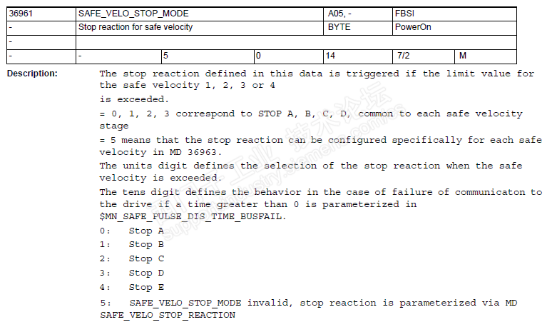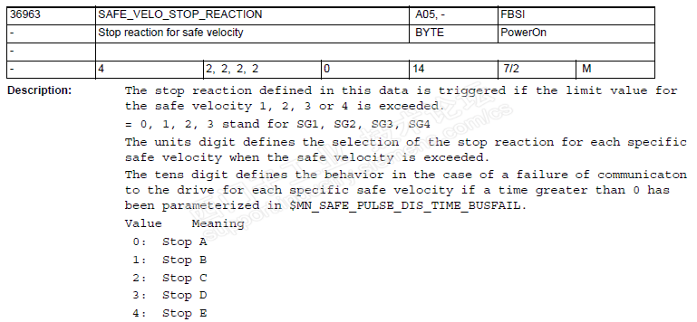 MD 36961: $MA_SAFE_VELO_STOP_MODE MD 36963: $MA_SAFE_VELO_STOP_REACTION[n] SG的响应,默认是MD36963中的值2,也就是Stop C。当然也可以根据实际情况自己设定。