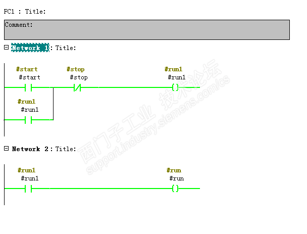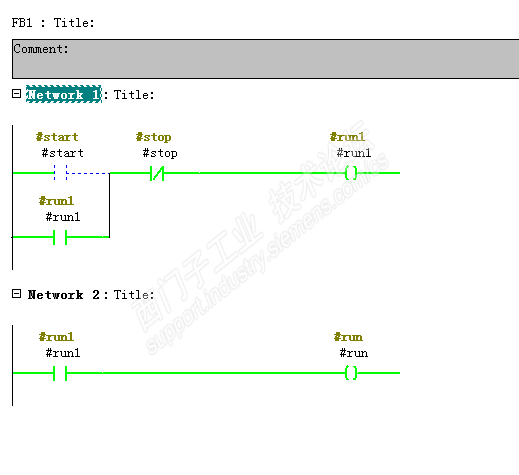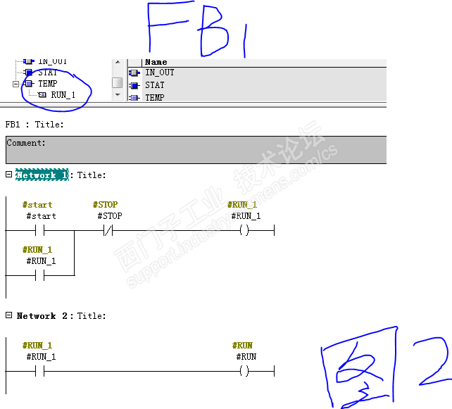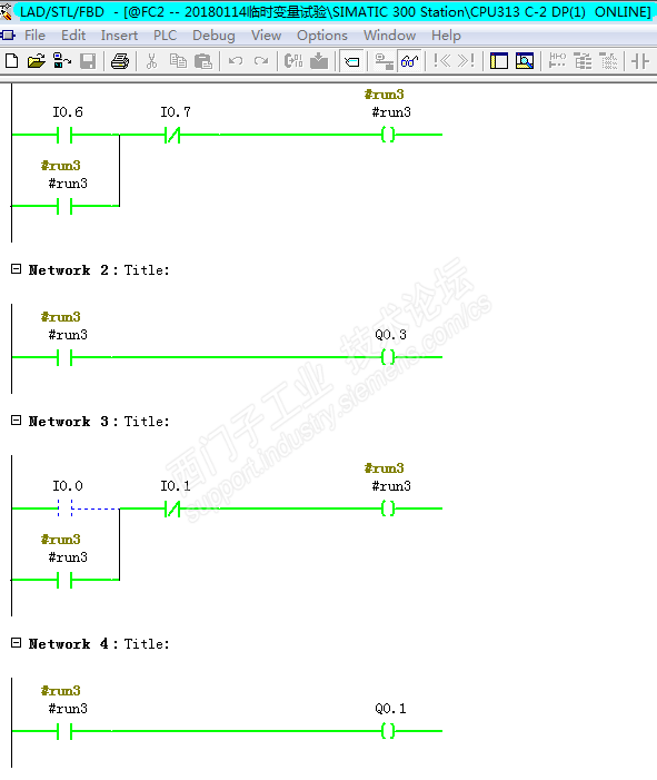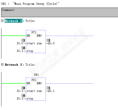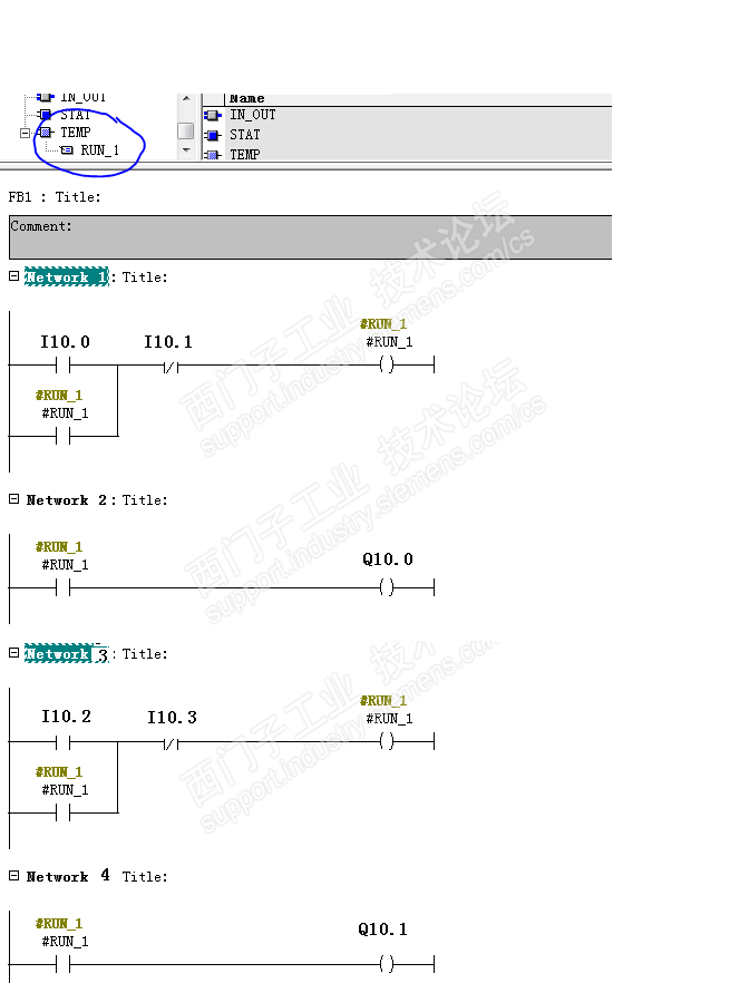 主题:回复:也来谈谈“先赋值后使用”!调用结束释放(只是不再占用,并不清零),所言极是! 所以 楼主做的实验,并不是FCFB 里的变量同名影响,只是 楼主用了 RUN1这临时变量实现自锁的原因》 I0.3 为1 看看 FB的输出Q0.1是否为1 就知道了! 其实 说到底 在使用临时变量时 先初始化赋值才是 规范的编程方法!