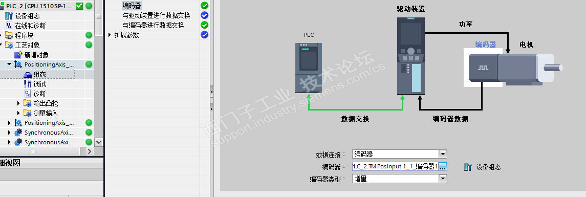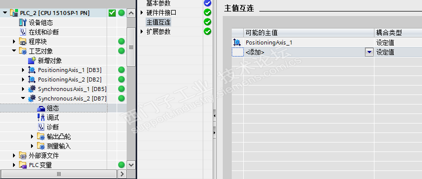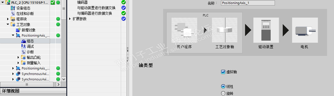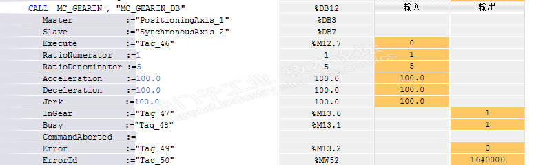 今天给大家分享的是基于1500的GearIn功能实现手轮控制V90PN。 CPU:CPU 1510SP-1 PN 工艺模块:TM PosInput 1 驱动:V90PN 主体思想就是建立虚轴,把手轮的编码器信号配置到这个虚轴上,另外利用这个虚轴做主轴,收控的V90PN做为同步轴进行同步。 配置如下: Trace曲线如下: 注意,只是软件仿真处理的结果,没有进行实际实验。
