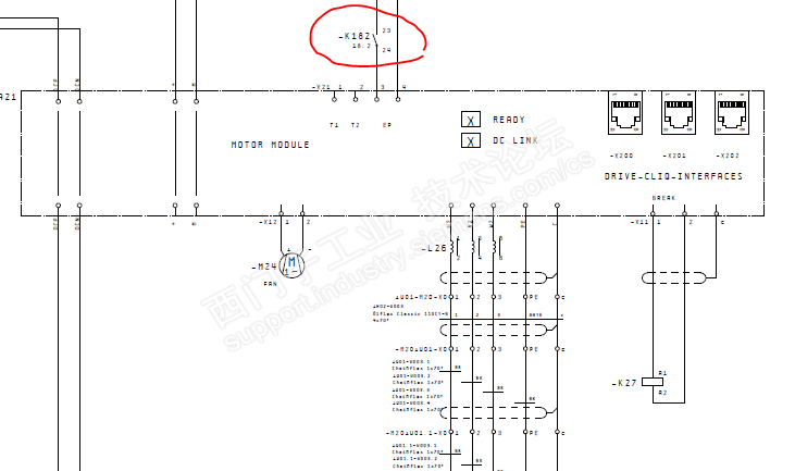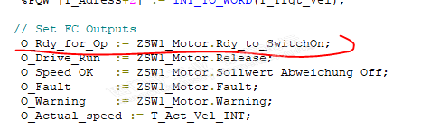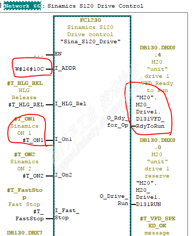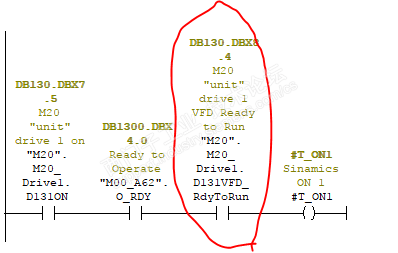 故障情况:由于芯棒螺丝断了,油缸退到位,抓取芯棒的行车误动作过载停机了。 处理过程:首先操作工切换到维修方式进行操作,可是有松绳报警,两个抓手的高度有偏差,将报警先屏蔽也不能让行车向上工作,机械人员一顿臭忙,也无济于事。 我在不紧不慢的看程序: 找到控制S120行车启升向上的控制块FC1230 然后让操作遥控器按钮,结果#t_on1没有信号,此时我就先查遥控按钮信号,从符号表内很快就找到。 测试I102.1有信号,而I20.4和DB1140.DBX15.4没有信号 查了一下图纸I20.4和DB1140.DBX15.4 信号是来自锻打机的信号,而锻打机上芯棒螺丝断了此信号才不正常,再说锻打机现在是关闭状态,所以我就先强制一个信号并了一个M999.0上去,再测试行车上升,还是不行, 我继续查到信号DB130.DBX8.4没有信号 这个信号是驱动器没有准备好,是FC1230的准备信号。 继续查到来自SCL的程序 查到此无法查了,因为o_Rdy_for_Op为s120驱动器状态字信号,只能查图纸了。 K182没有工作 在维修方式操作要K303工作,K303来自Q1.2 I103.0来自遥控器上的一个按钮 让操作工同时按上升和I103.0按钮结果可以上升运行了。 等行车开离锻打机上方后,到某一空地行车抓手下降进行整理钢丝绳,使得行车两个抓手高度一致。 做完这些当打开行车抓手时,G1是可以打开的,G2抓手打不开,当时G2上的芯棒是机械人员手动放掉的,所以芯棒信息在MTS上还存在。 此时我打开Fc101看到G2抓手还是保压的I24.6和I24.7无信号,当时自动程序没走完,我就让PLC暖启动一次,这样自动程序就不执行了。 可是抓手上还有芯棒信息,是由两个压力传感器I24.6和I24.7提供,此时我屏蔽此信号,G2抓手可以打开了,并且两个压力传感器也正常了,问题完美解决。 此维修实例,分享了当遇到程序无法继续查时要变相思维,查驱动器电气图纸,变则通。 此故障涉及到三个PLC的程序,锻打机,芯棒更换行车,MTS传送系统。