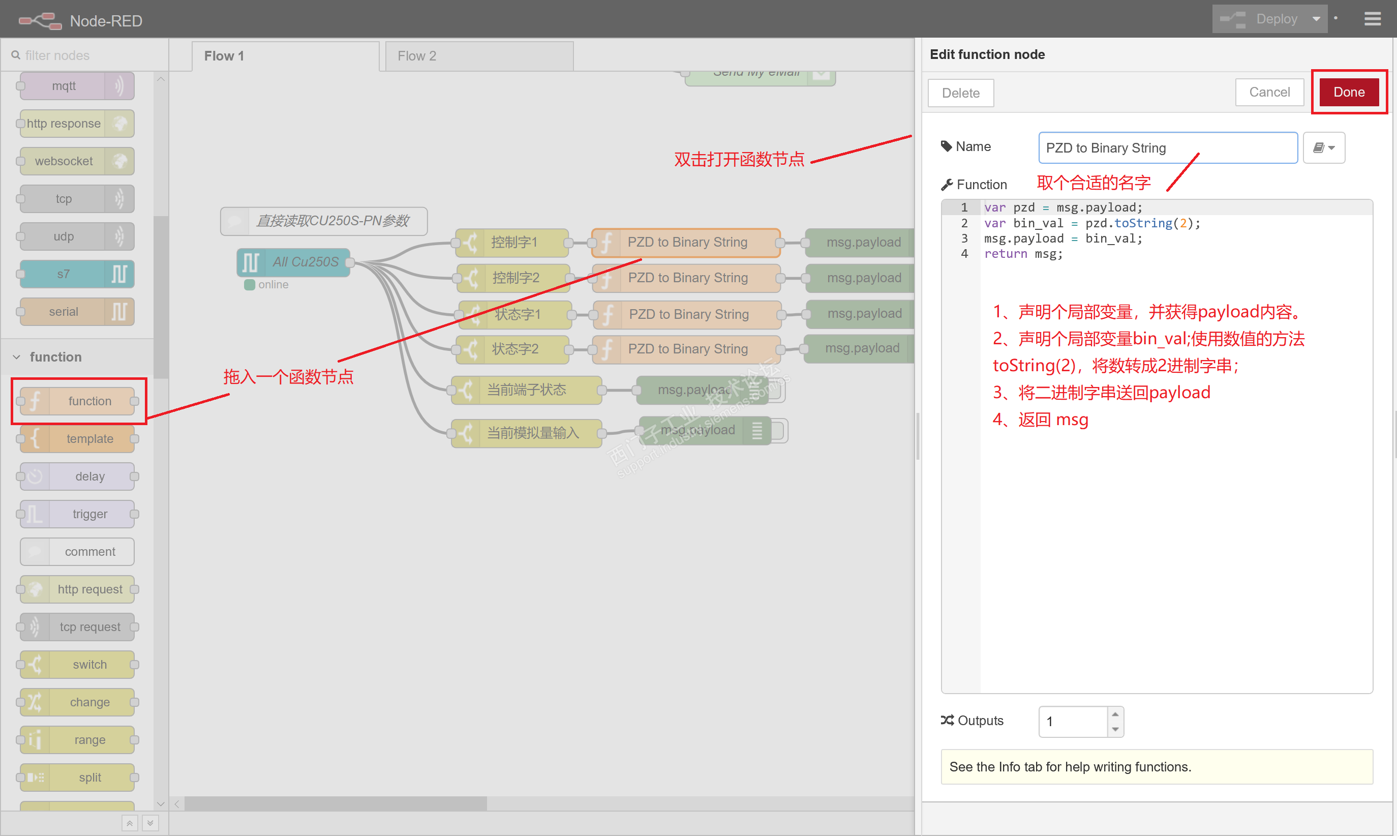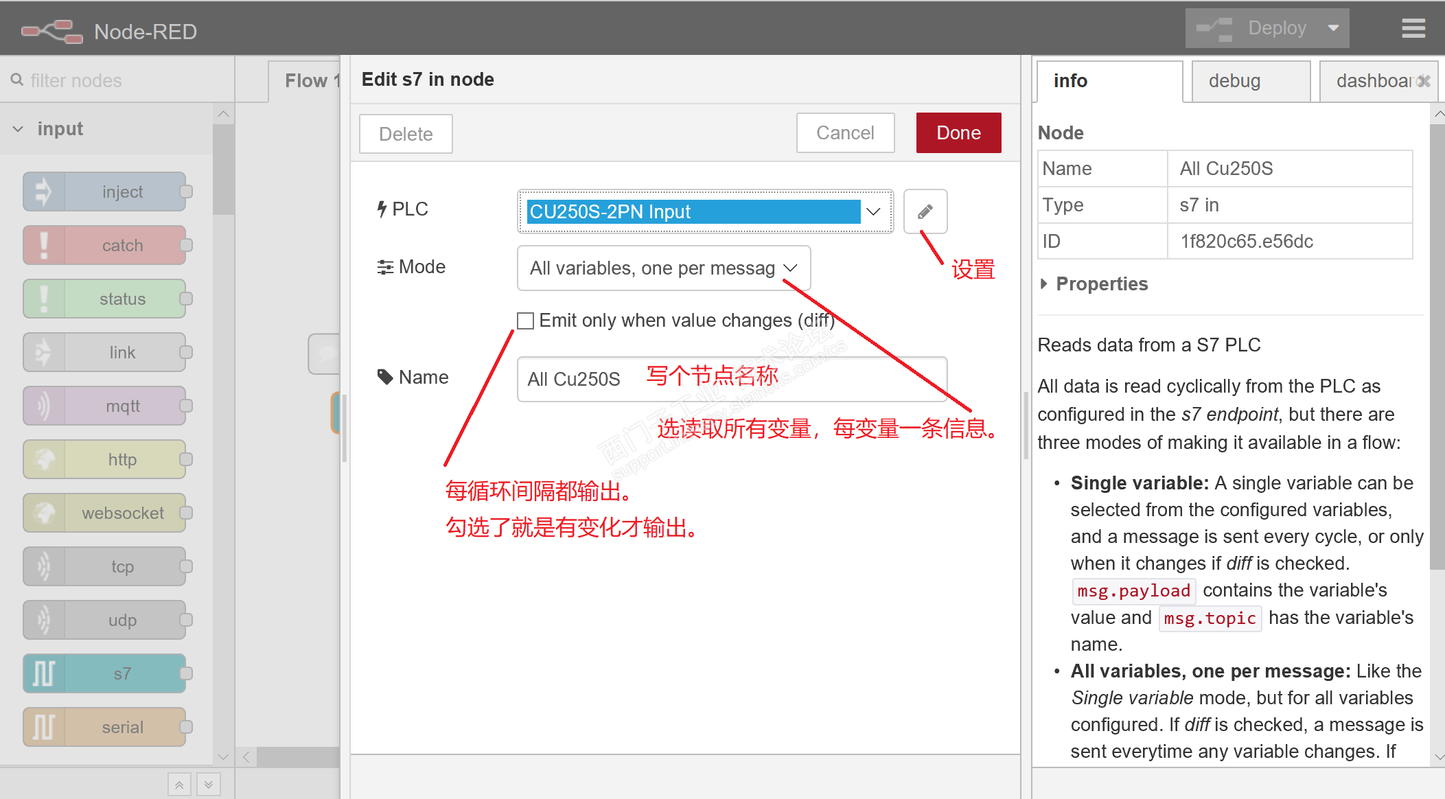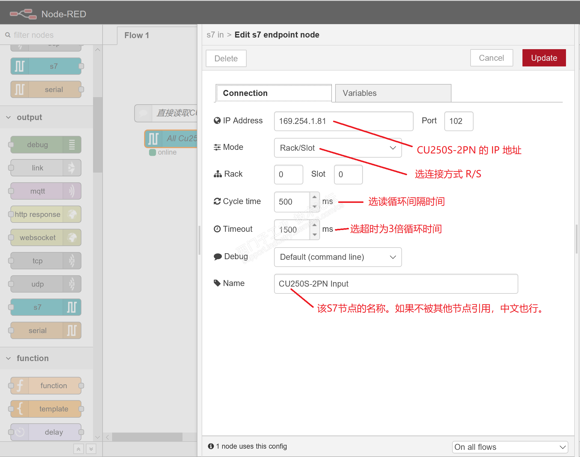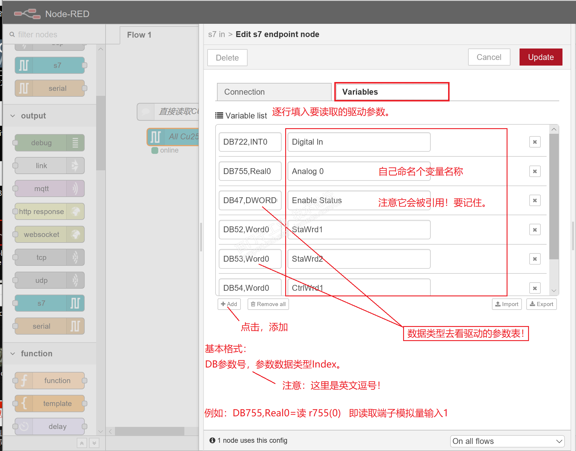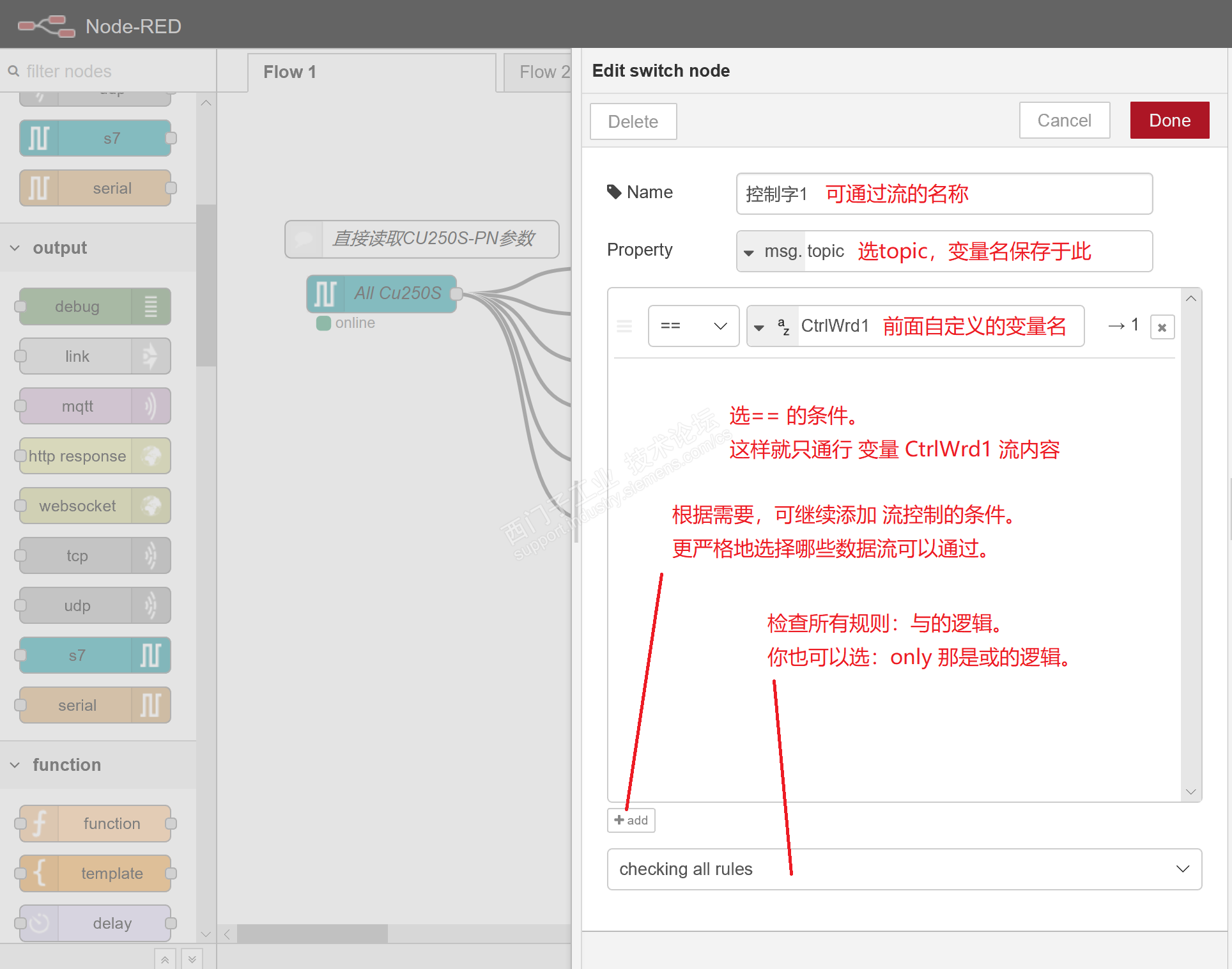 前面 IOT2K的学习(二)说了 如何获取 S7 1200和LOGO!数据的方法。 前提:目前只是针对PN类型的驱动,对于G120-2PN 要求固件至少是 V4.7。 首先,再拖入一个S7 节点;双击打开它:点击“笔”编辑;做如下的设置。 设置通讯参数 在变量选项条中,填入要读取的参数。注意格式。 完成后,点击 Update 更新 在返回界面中:设置流输出的方式 这样几步就完成了读取CU250S-2PN的参数。 ========================================= 拖入一个 switch节点,设置如下: 在它后面 拖入一个 debug 节点。