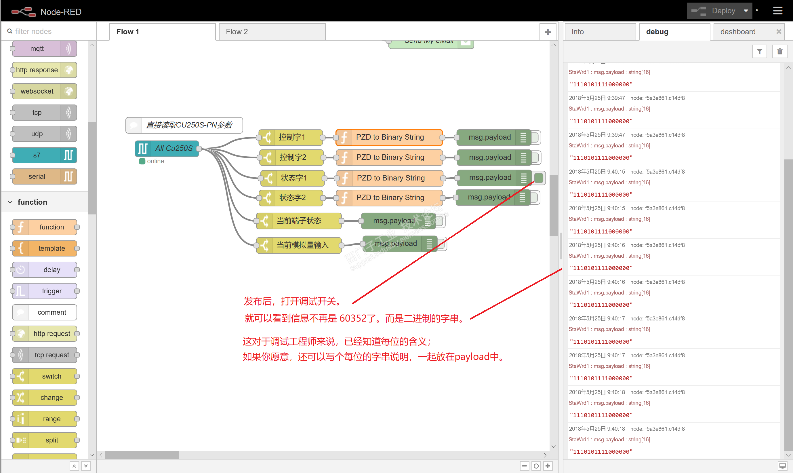 主题:回复:现在可以说了,IOT2K学习 读取驱动参数部分(三)原本是想写在信息处理部分的。 发布后,就可以看到结果了。 如图: 你把toString 括号中改成16,看看什么结果?改成8呢?这里就能看出 Javas cript 强大的功能。 如果设计的好,你还可以根据状态字的指引(例如,过载置零了)去读相关参数,(比如,变频器持续温度、风机..;查寻记录文件的前期内容等等)一起打包,发送给维护、管理者。