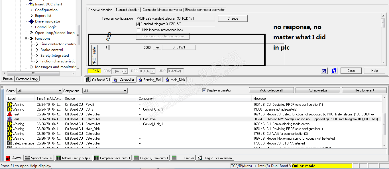 主题:安全功能Safety integrated 问题求助??? S120想启用安全功能中的SLS通过PROFIsafe通讯进行控制,用于安全限速保护(已购买相应授权并已对驱动器授权)。 按照手册已经将PLC端和驱动器端设定好,使用的是PROFIsafe 30进行PLC和驱动器间的通讯控制。 但在PLC中对驱动器进行控制时(将SLS置位或直接写一个数字到驱动器中)但发现驱动器中的PZD传输区域并没有任何反应如图—-驱动器中测试。而且发现驱动器中有报警如图片--驱动器中存在的报警。 PLC和驱动器中都是按手册进行配置的,感觉没问题。但经过测试感觉像是驱动器和PLC并没有进行控制字或状态字的交换,因为在PLC中进行控制,驱动器PZD区域中没有任何反应。 求高手指点,难道是驱动器授权没授好? 谢谢!!!