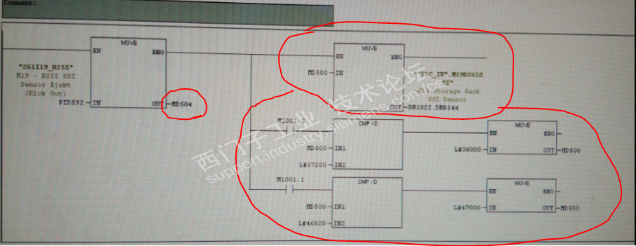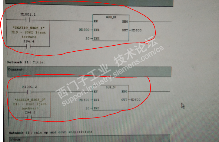 主题:老外的设备为什么买的那么贵,还容易出故障,骗钱还是高大尚。 前几天去山东潇洒了些天。 回来后开始忙碌,我们的冷床坏了,然后所有的热管子吊到了缓存区,结果悲剧了,缓存区的编码器没有防护罩被烫坏了,导致24V短路 M00_F143跳闸,在没有找到短路处时试送了一次过了十几分钟又跳闸,开始找原因才发现编码器被烫坏。 由于编码器烫的面目全非看不到型号,插头也被完全烫坏,电缆也烫坏一部份,只能到仓库找了个一看差不多样子,型号:ATM60-A1A0-K19装上去,结果没有数据。 开始怀疑模块也坏了,换上新的模块也是没有数据。 没办法把编码器插到其他正常的同样的编码器处也没有数据。 再仔细一看正常的地方编器型号为ATM60-A1A0-K18,新的型号和原来的不样,可是仓库没有ATM60-A1A0-K18 怎么办呢设备又不能停产,该编码器仅仅是判断油缸的行程,老外太奢侈,我认为做两个传感器来判断不就行了,成本还低,怪不得买的贵。 为了能让生产持续,我决定改程序如下: PID592是读取的编码器送到DB1022.DBD144内,DB1022.DBD144有几处在用,M1001.1和M1001.2分别是操作油缸上下的。 我就在后面加了程序当M1001.1工作时来仿真编码器数值变大,当M1001.2工作时来仿真编码器数值变小,20是PLC扫描周期内加减的幅值。 上面的程序是当加到限制值后,认为油缸升到位。 当减到限制值后,认为油缸降到位。 等生产结束后,准备加一个下限位传感器,来保证钢管过来时不会撞到油缸翻转架。 通过测试,生产又可以继续了,还不用编码器,比起老外的高大尚的编码器真实用。